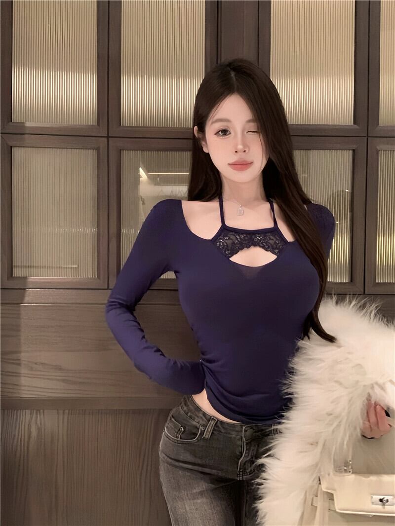純粋な欲望スタイルのレースのホルターネック中空長袖 T シャツの女性の秋のオフショルダー スリム ウエスト ショート インナー レイヤリング トップ ロング オータム 秋物 Tシャツ bstraw9250057848 | beaute25