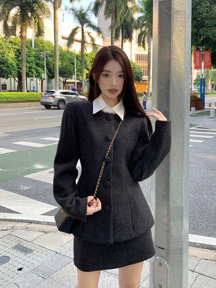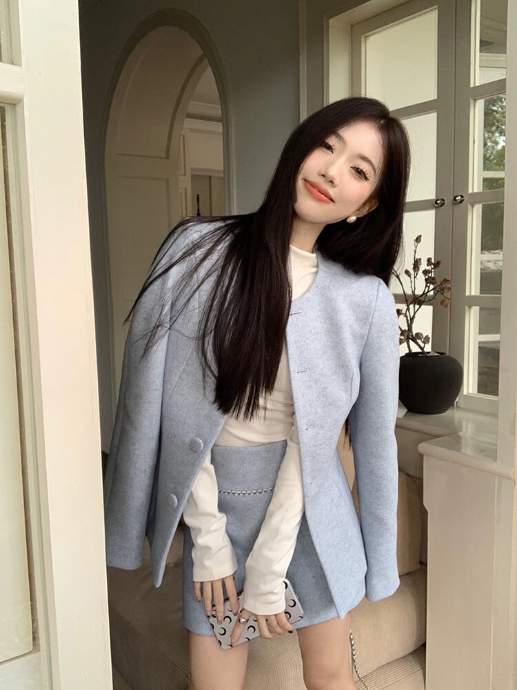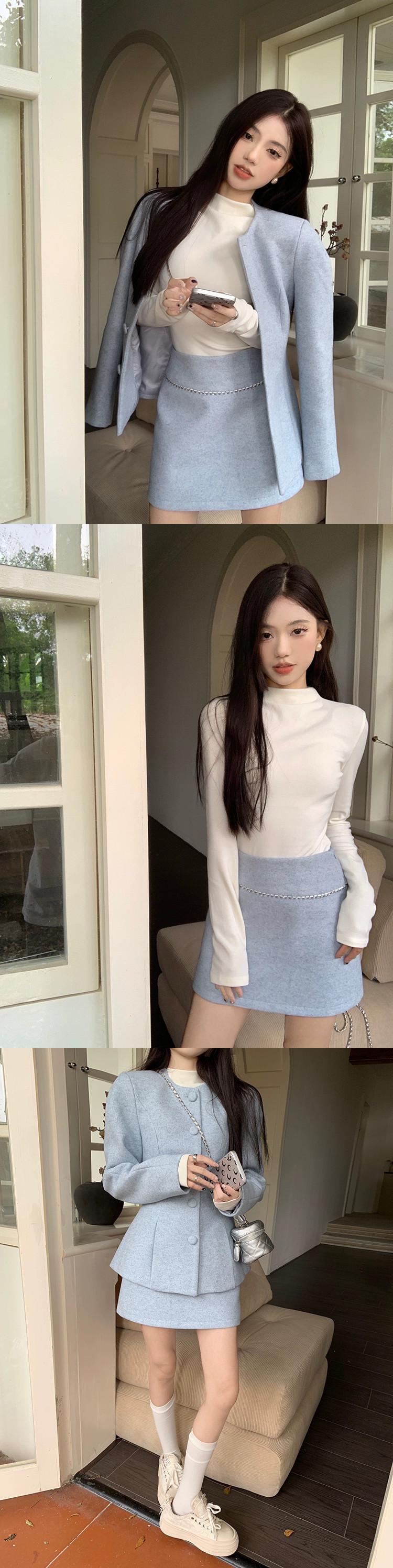 色:アクアブルージャケット,アクアブルーのスカート,白いTシャツ,黒いジャケット,黒スカート