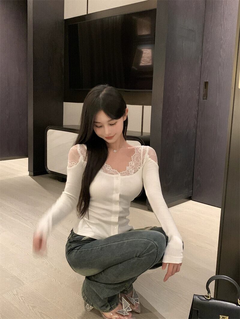 黒レーススプライシング長袖セーター女性秋と冬のセクシーな純粋な欲望スリムショートトップとボトリングシャツ ロング ブラック オータム 秋物 ウィンター 冬物 ピュア bstraw96187432488 | beaute25