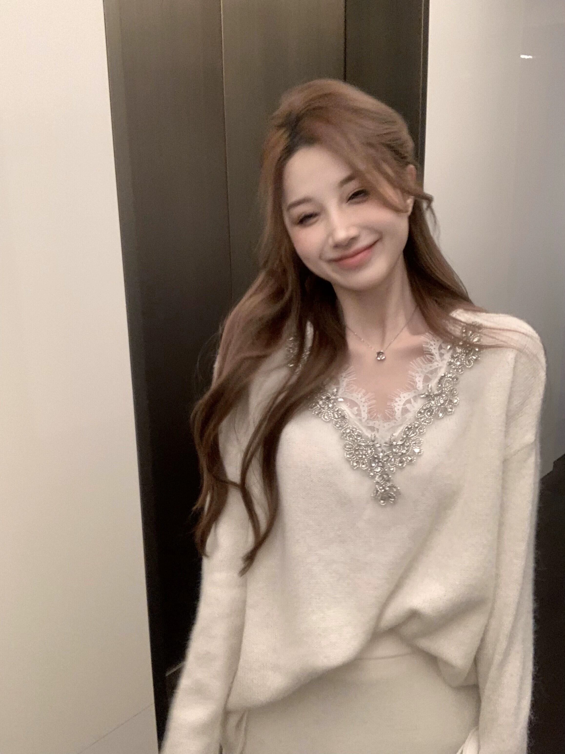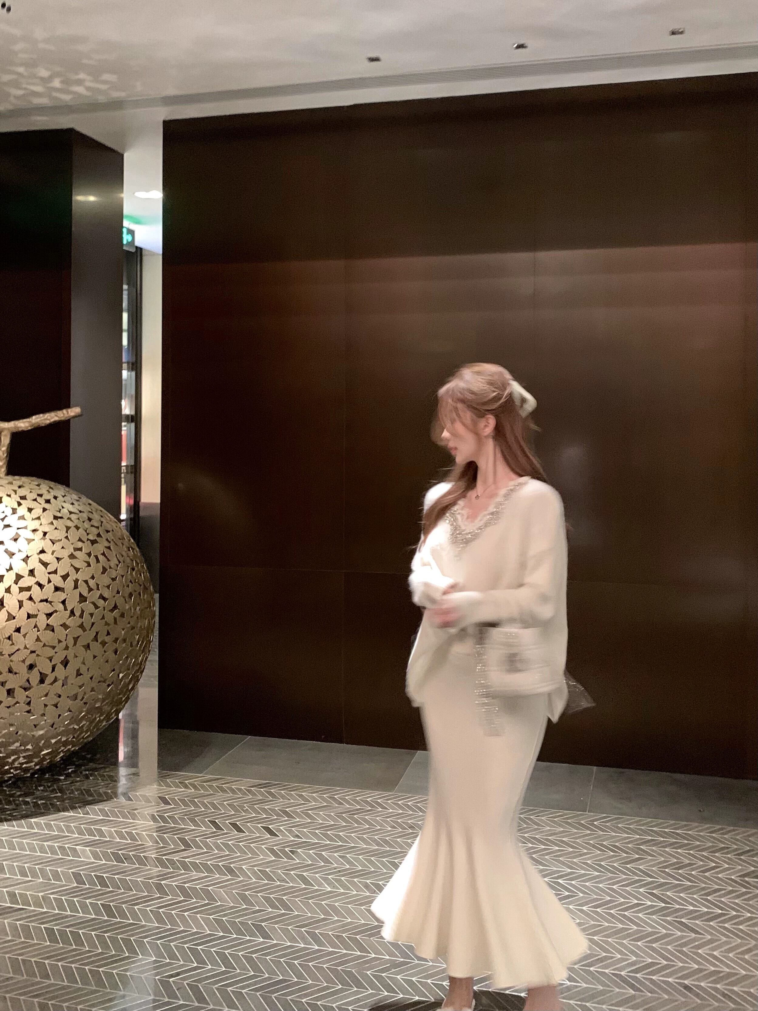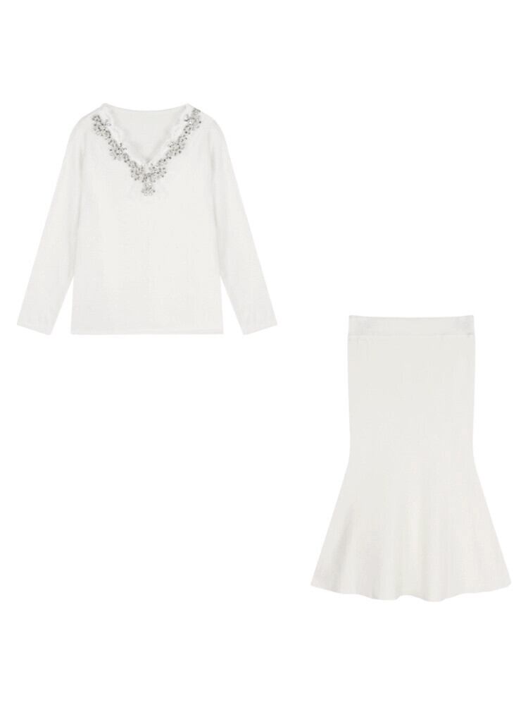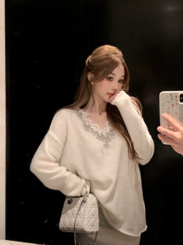 重工業ラインストーンレーススプライシング V ネックセーター女性の秋と冬のルーズホワイトセーターハイエンドの超見栄えの良いトップ オータム 秋物 ウィンター 冬物 Vネック bstraw29208526426 | beaute25