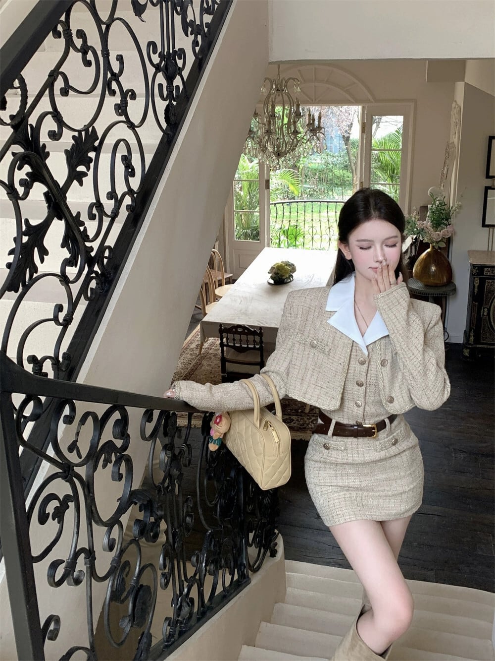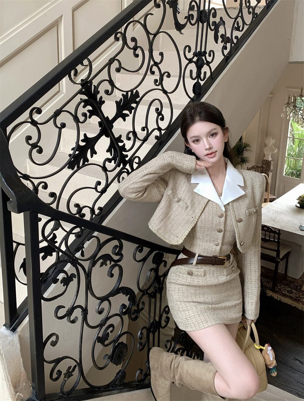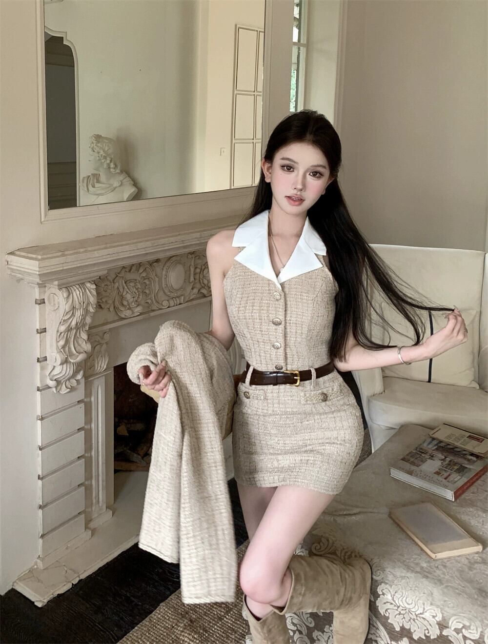 ツイード長袖ショートコートレディース秋冬リッチ娘のリトルフレグランススタイルスーツホルターネックワンピース2点セット ロング オータム 秋物 ウィンター 冬物 bstraw4840355948 | beaute25