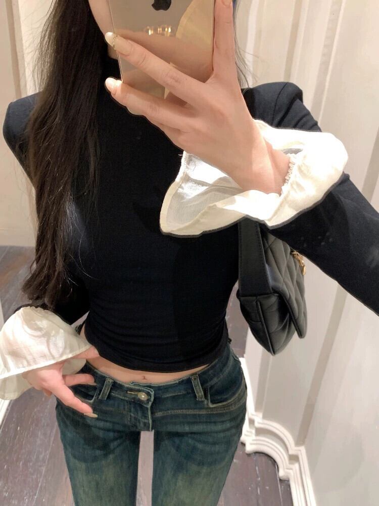 ハーフタートルネックベルスリーブスプライス Tシャツ女性の秋と冬黒タイトショートシックなボトリングシャツ長袖インナートップ ロング ブラック オータム 秋物 ウィンター 冬物 bstraw66955516283 | beaute25