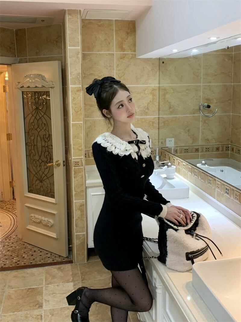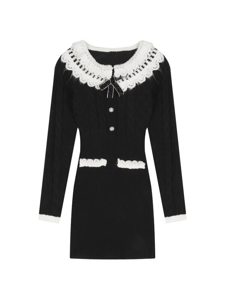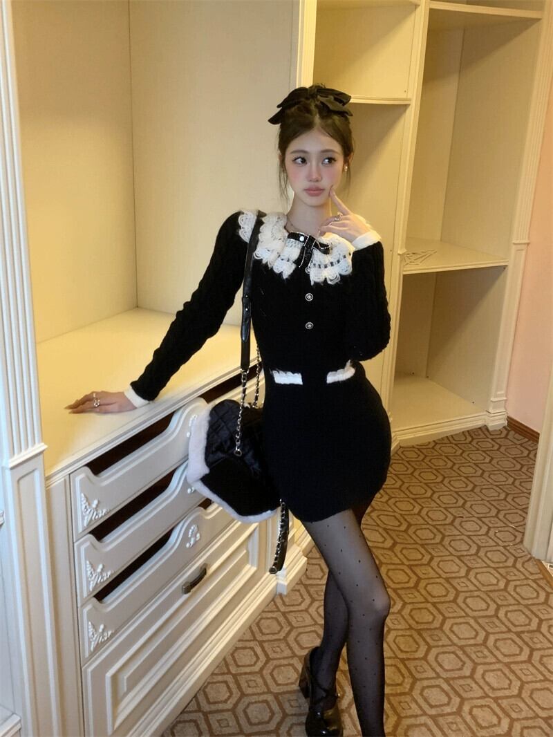 黒のパッチワークニットドレスの女性、秋と冬のセーターボトムスカート、純粋な女性のようなスタイル、スリムなヒップ抱きショートスカート ブラック オータム 秋物 ウィンター 冬物 スリムヒップ ピュア bstraw49943555539 | beaute25