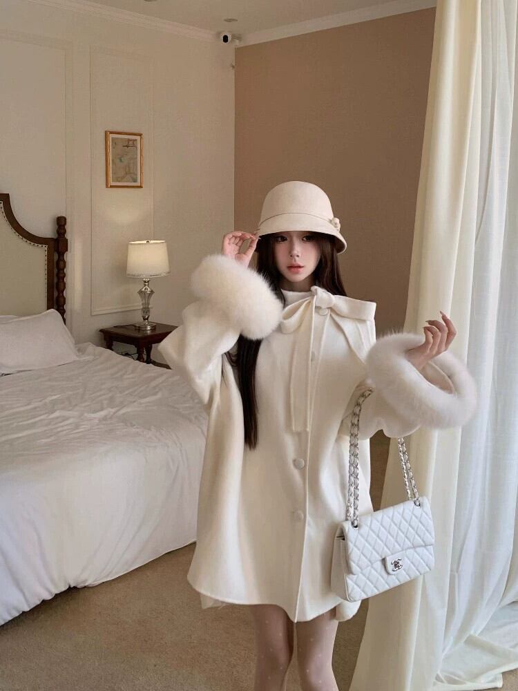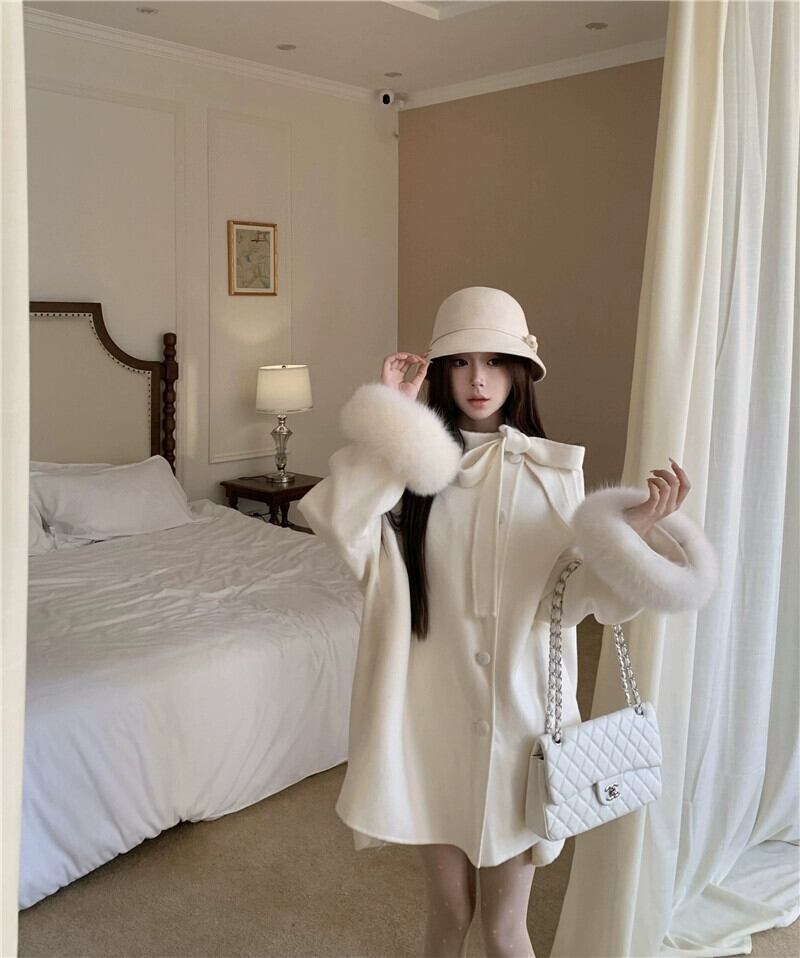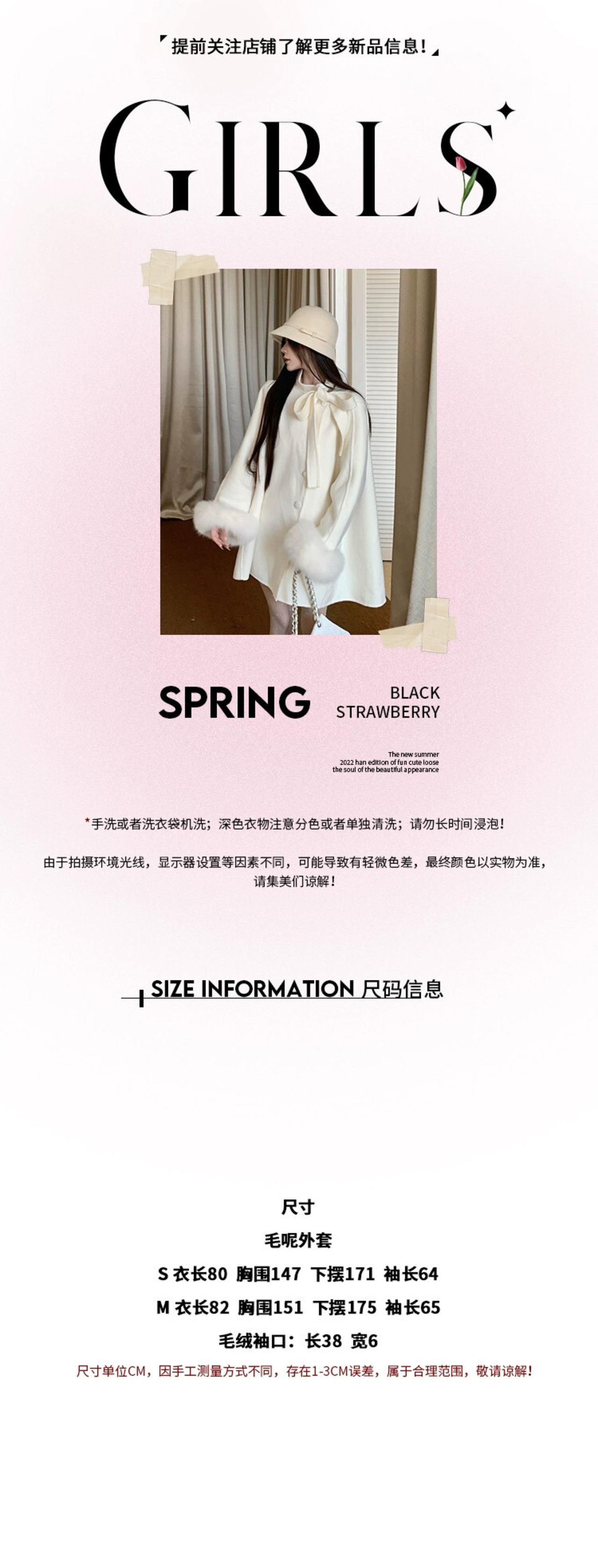 毛皮のような袖口とリボンが付いたウールのコート、女性、秋と冬のルーズなミッドレングス、ハイエンドで気質のマントウールのコート オータム 秋物 ウィンター 冬物 bstraw79413573515 | beaute25