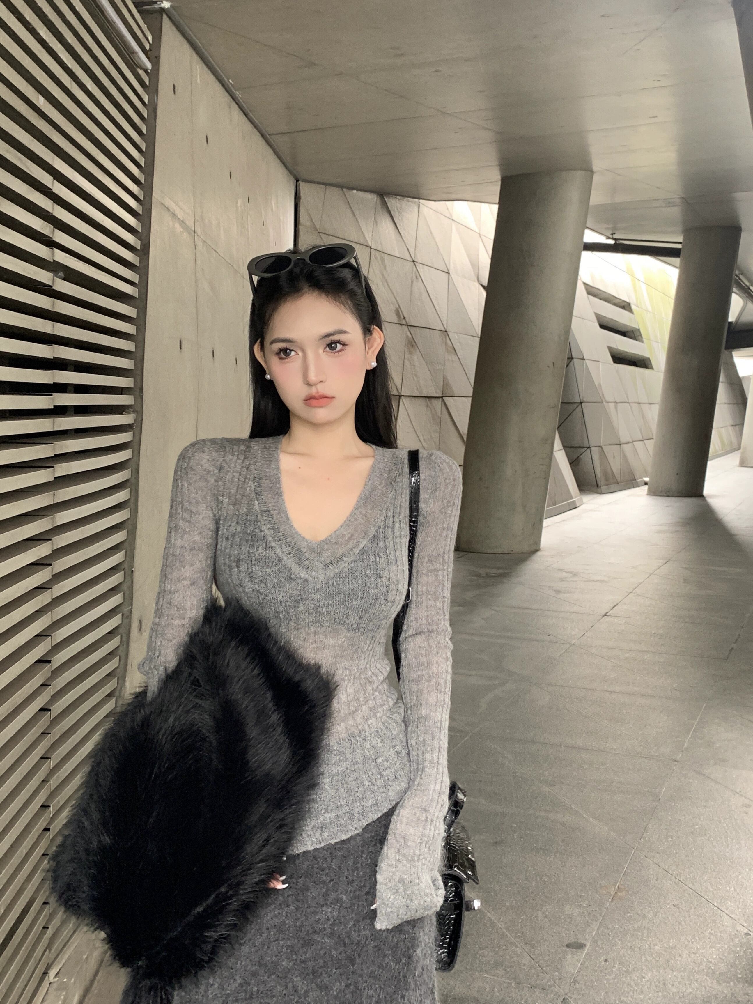 怠惰なピットセーターグレー V ネック長袖セーター女性の秋と冬の 2023 新しいタイトフィットボトリングトップ ロング オータム 秋物 ウィンター 冬物 Vネック bstraw54436435481 | beaute25