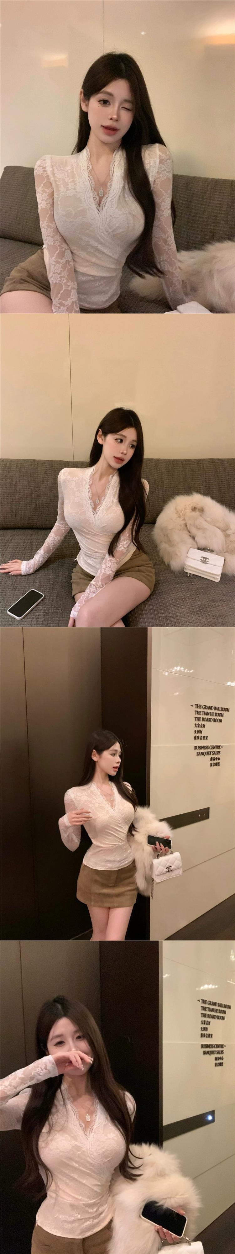 黒長袖 V ネックレースシャツ女性初春の新セクシーな純粋な欲望スリムインナーレイヤリングシャツトップ ロング ブラック スプリング 春物 Vネック ピュア bstraw28515780212 | beaute25