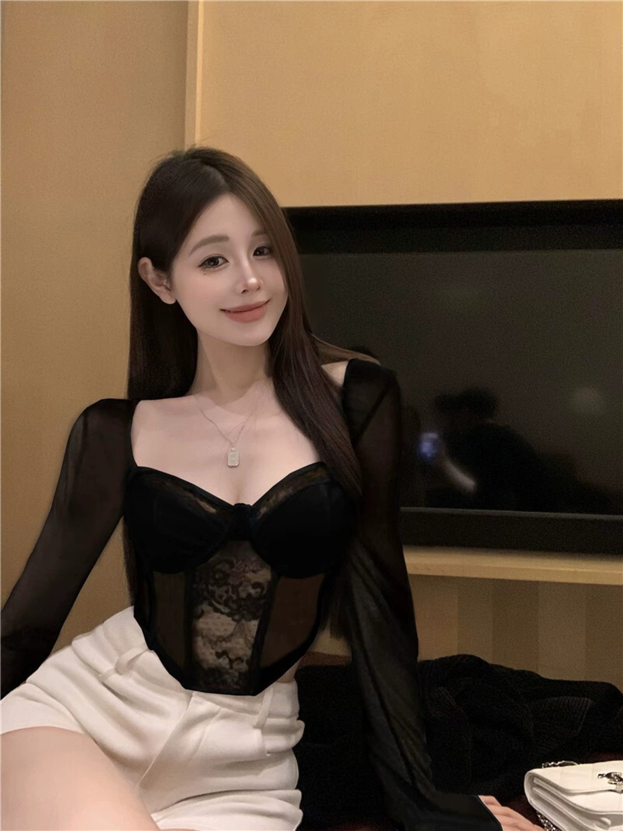 レースステッチ中空長袖スクエアネック Tシャツトップ女性春セクシーな純粋な欲望スリムショートインナーレイヤリングシャツ ロング スプリング 春物 ピュア スクウェア bstraw60791494288 | beaute25
