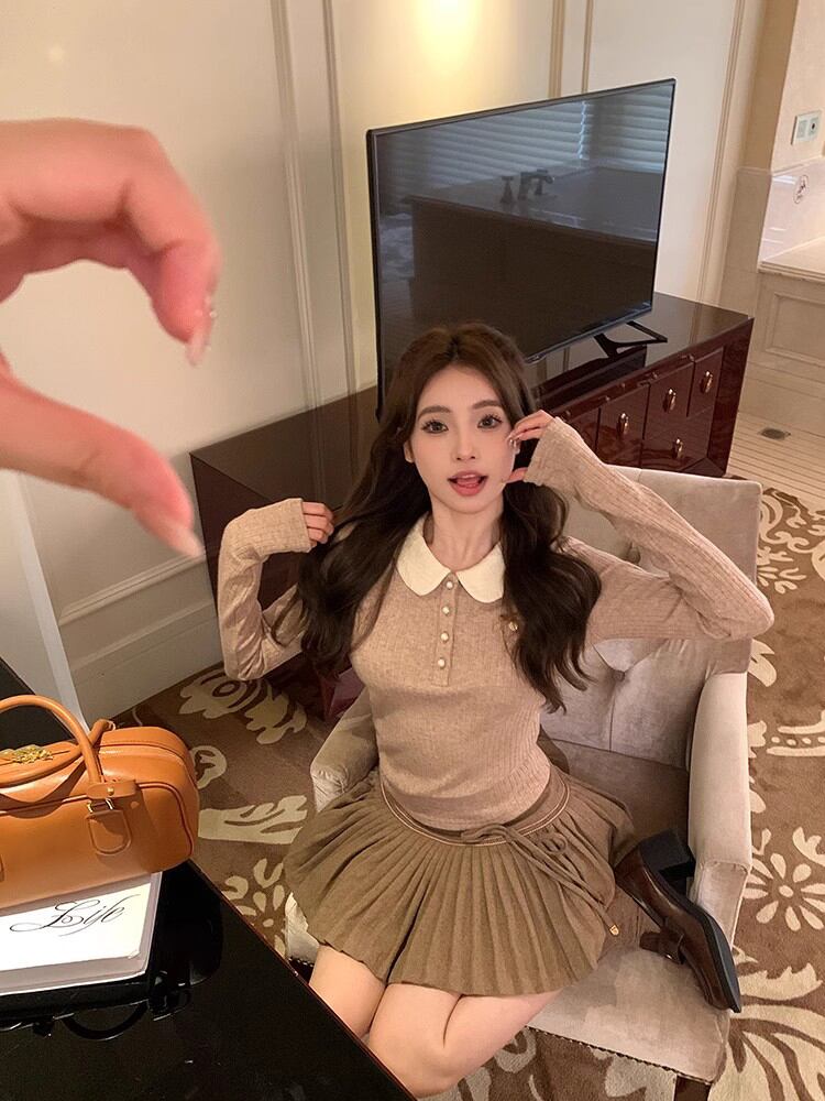 色:オーツニットセーター,カーキ色のスカート