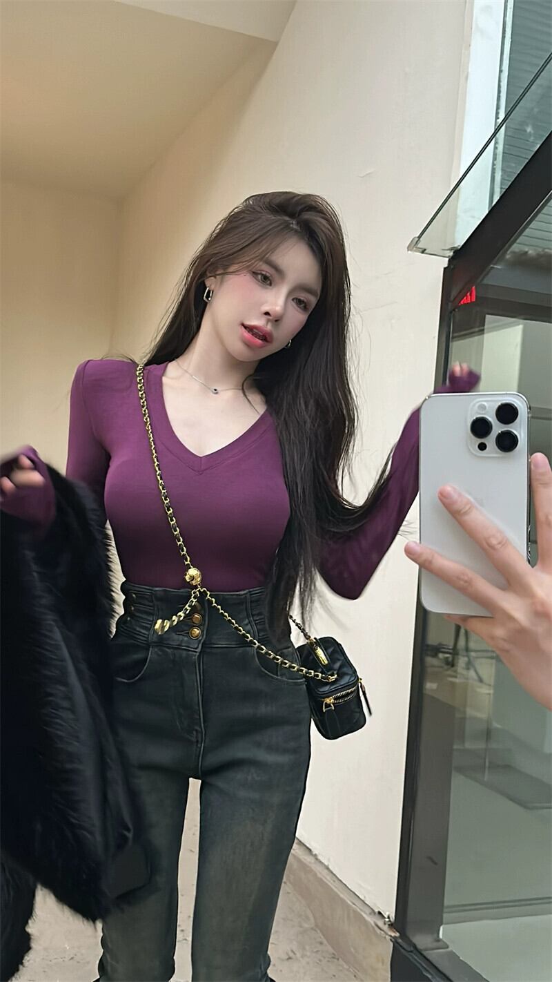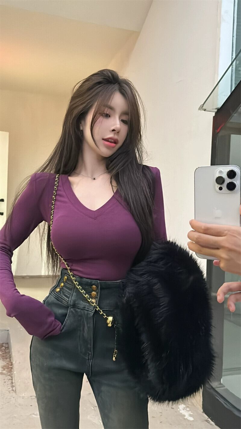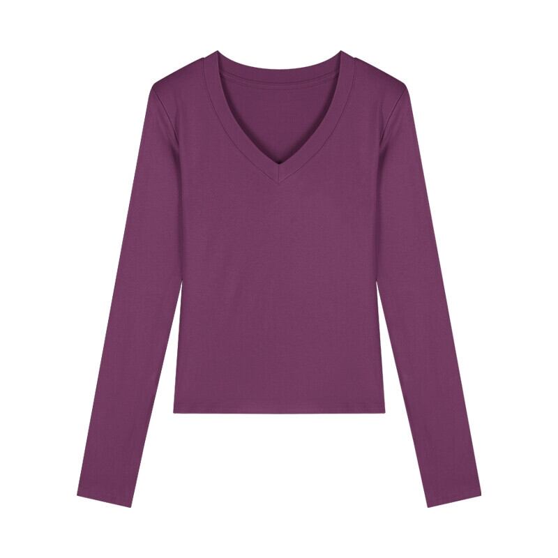 豪華な紫色の長袖 V ネック Tシャツボトシャツ女性春セクシーなスリムフィットインナープルオーバートップ ロング スプリング 春物 Vネック パープル bstraw87610662709 | beaute25