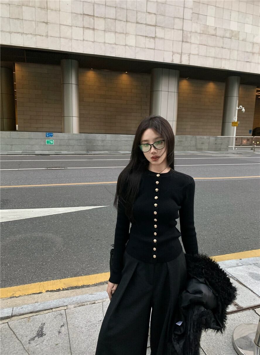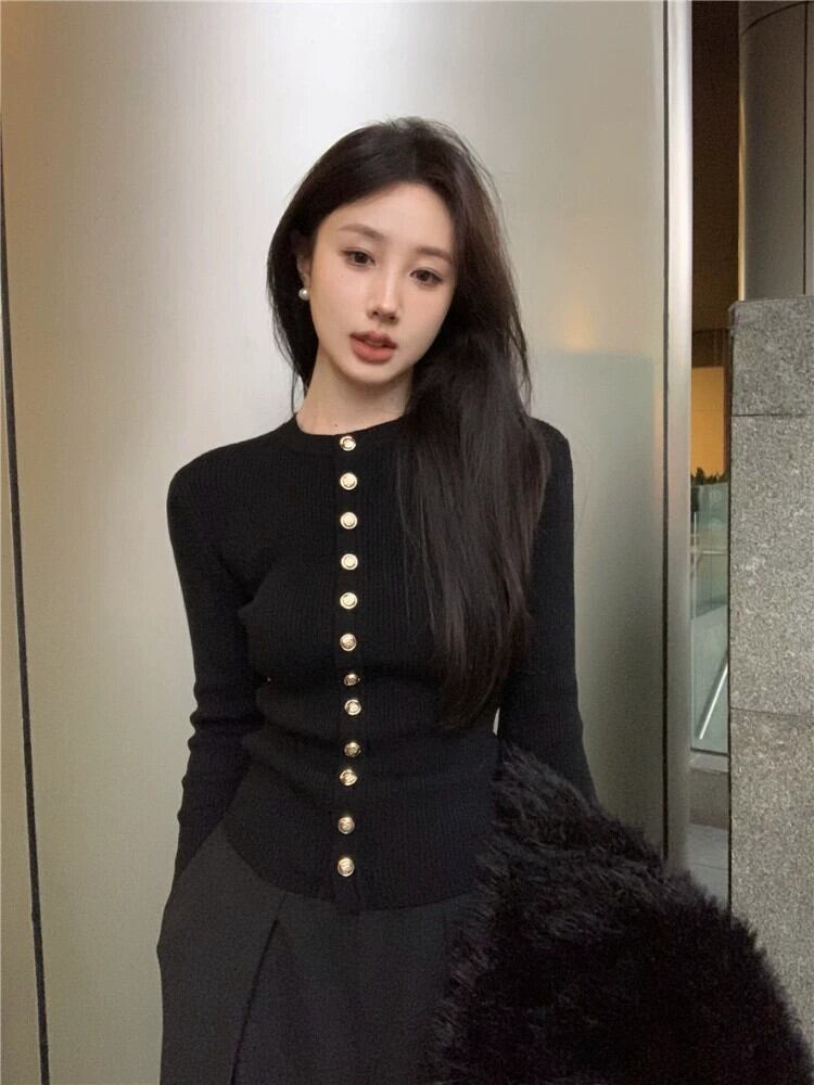 黒のラウンドネック長袖ニット カーディガン女性の 2024 年初春の新しいスリム フィット セーターとボトリング トップ ロング ブラック スプリング 春物 Oネック bstraw90777581610 | beaute25