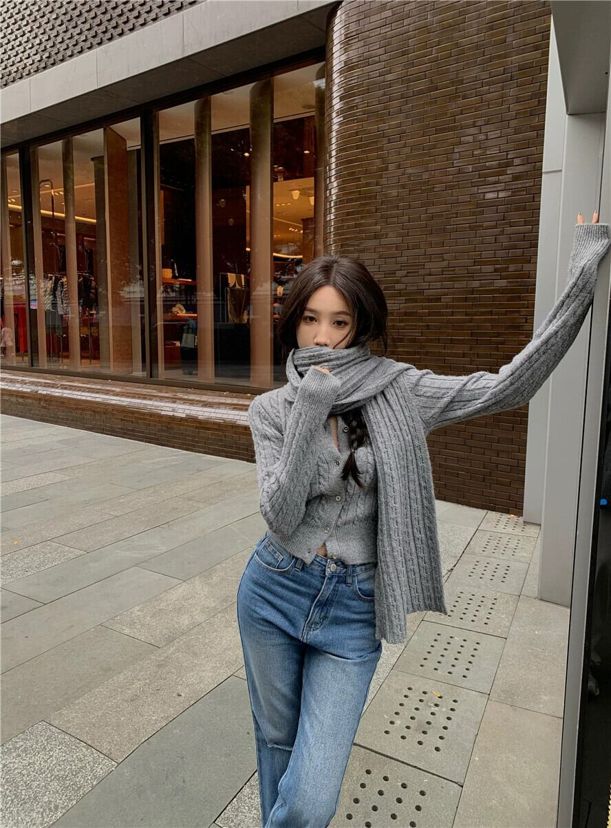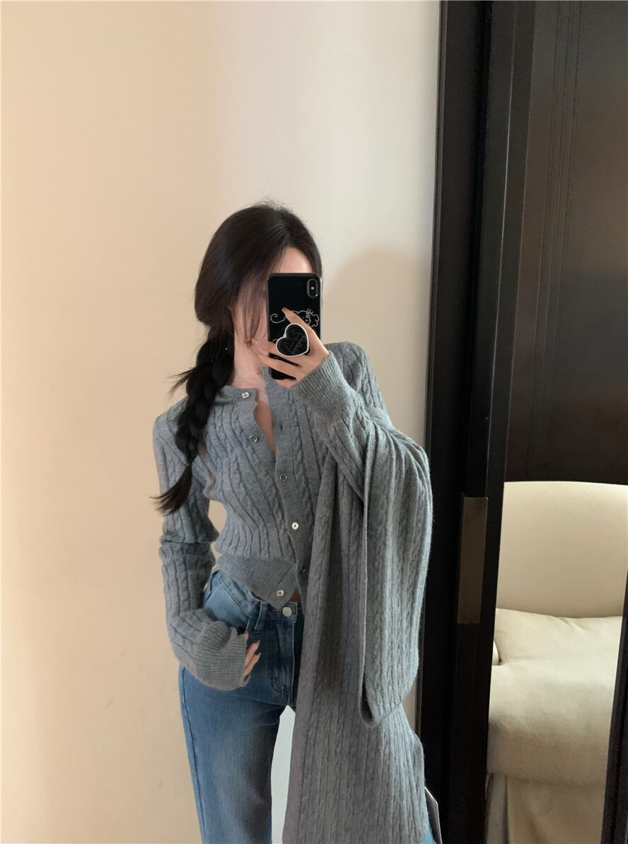 グレーツイストラウンドネック長袖ニットカーディガン女性の秋と冬スリムフィット怠惰な肥厚スリムセータークロップトップ ロング オータム 秋物 ウィンター 冬物 Oネック bstraw71383296324 | beaute25