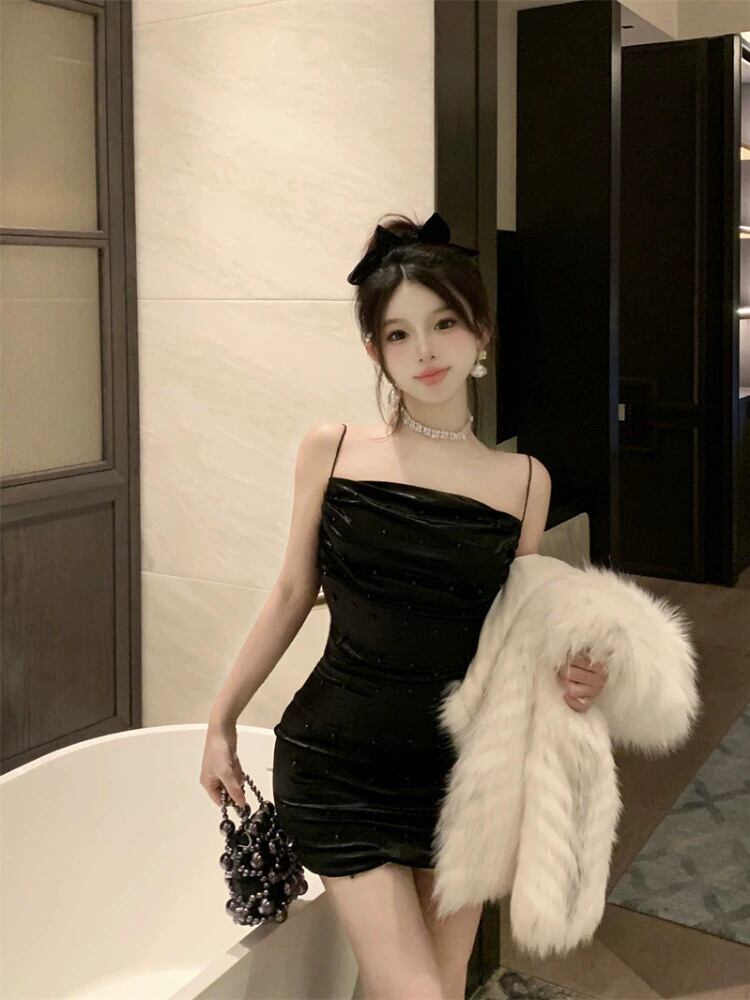 重工業パールベルベットサスペンダードレス女性早春レッド純粋な欲望セクシーなインナースカートタイトヒップハグショートスカート スプリング 春物 ピュア 真珠 bstraw7483074860 | beaute25