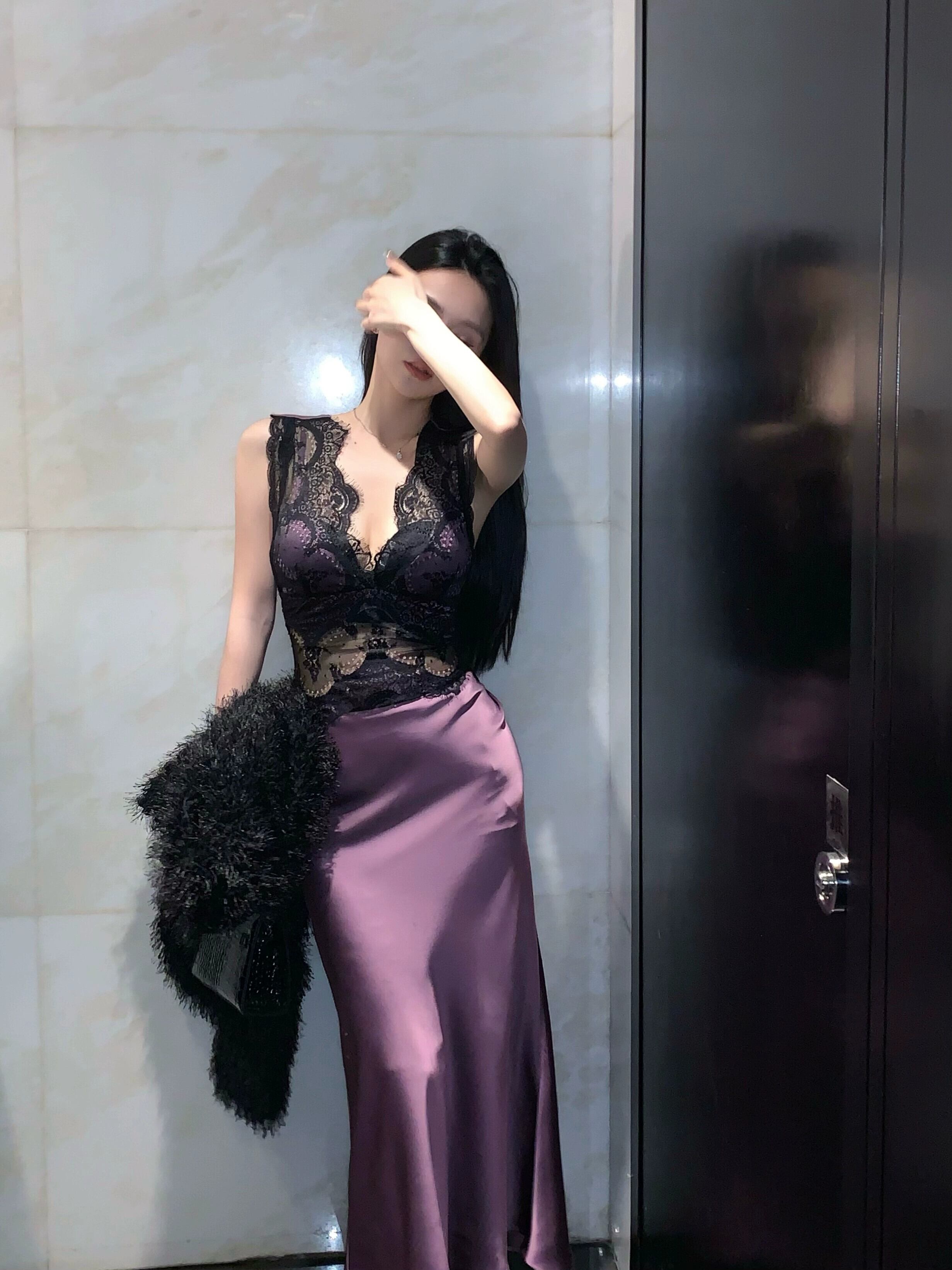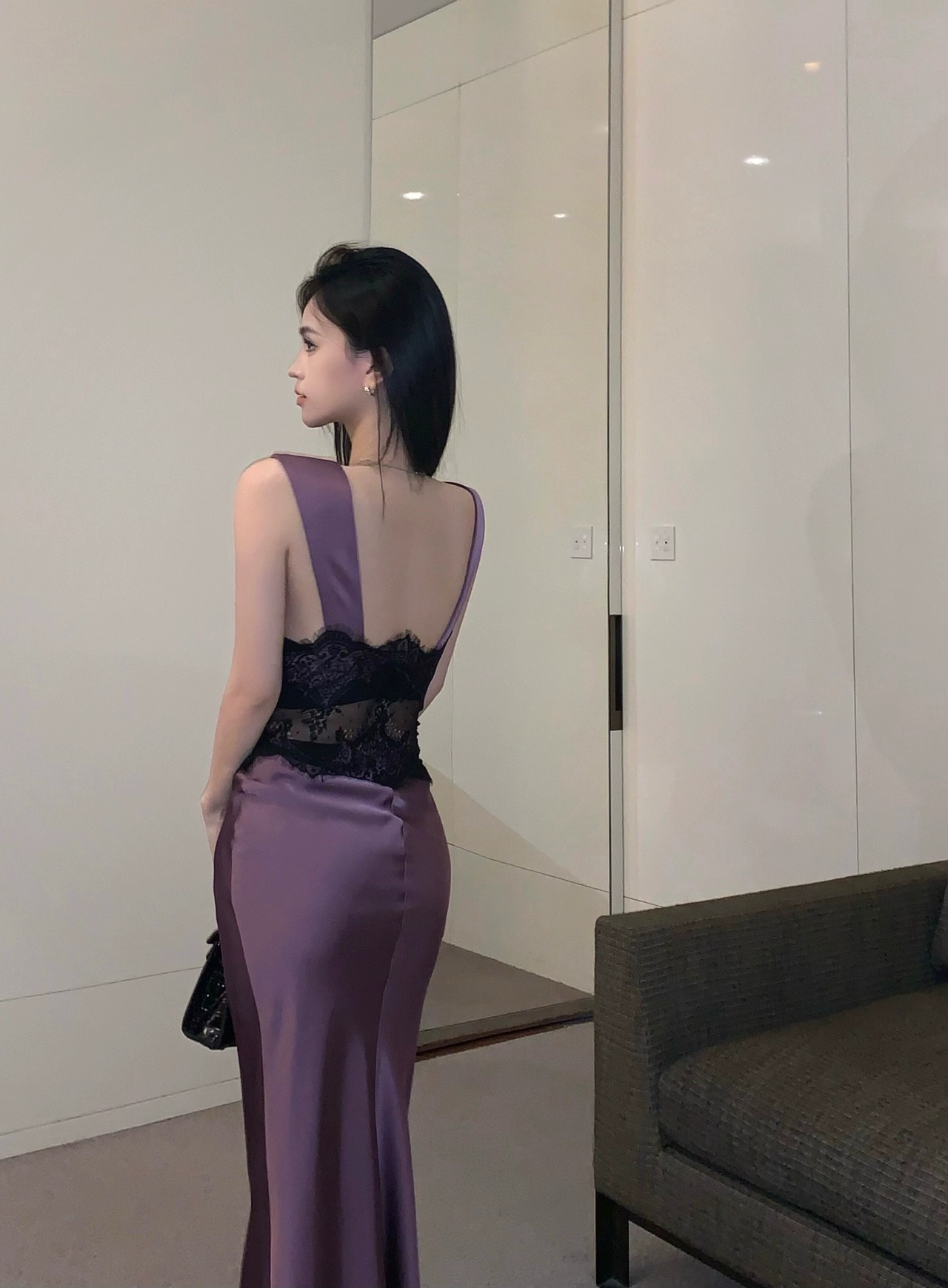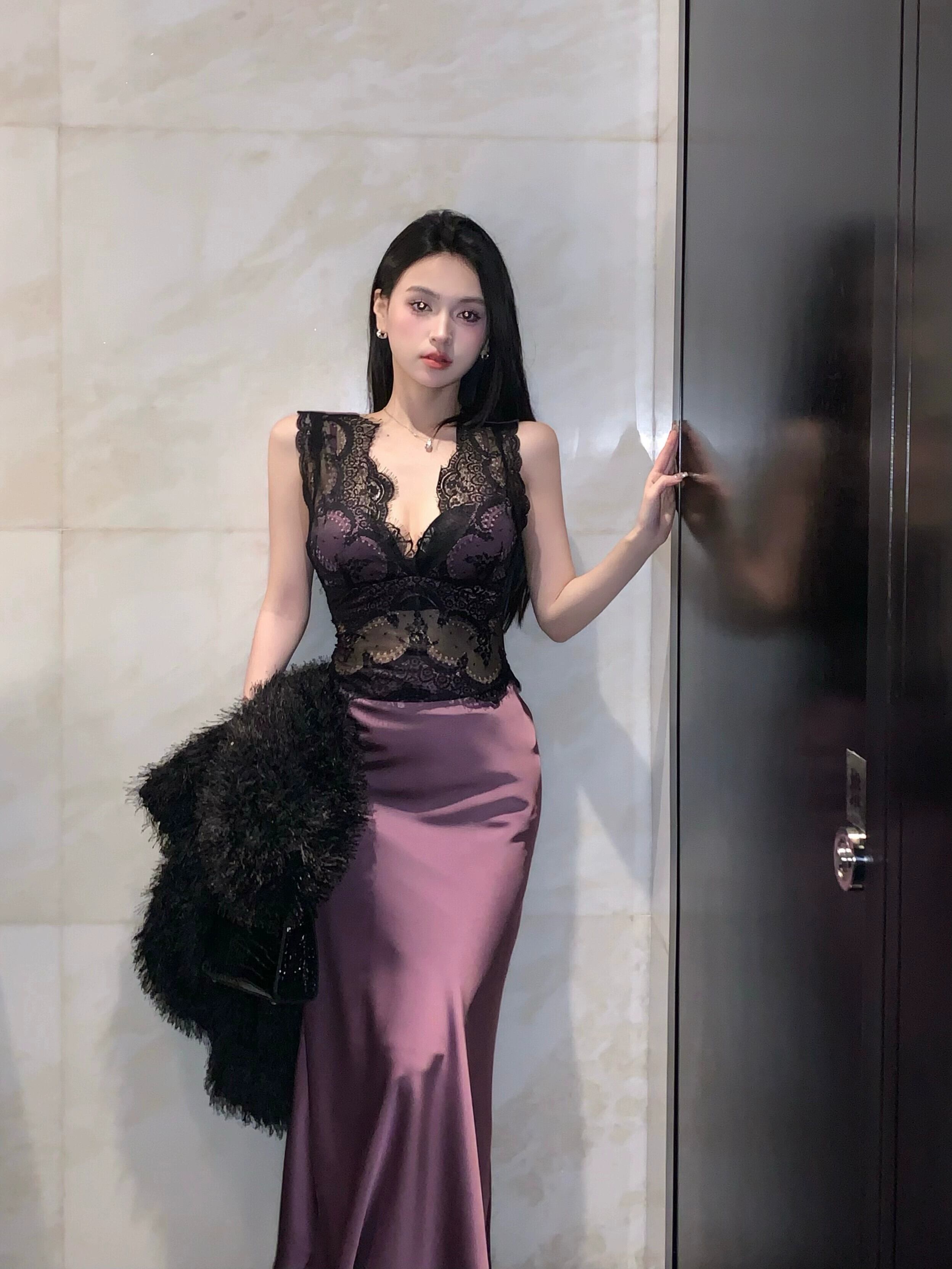 レースステッチサテンドレス女性の春のセクシーな V ネックノースリーブベストスカート気質ウエストカバーロングスカート スプリング 春物 Vネック bstraw75956204267 | beaute25