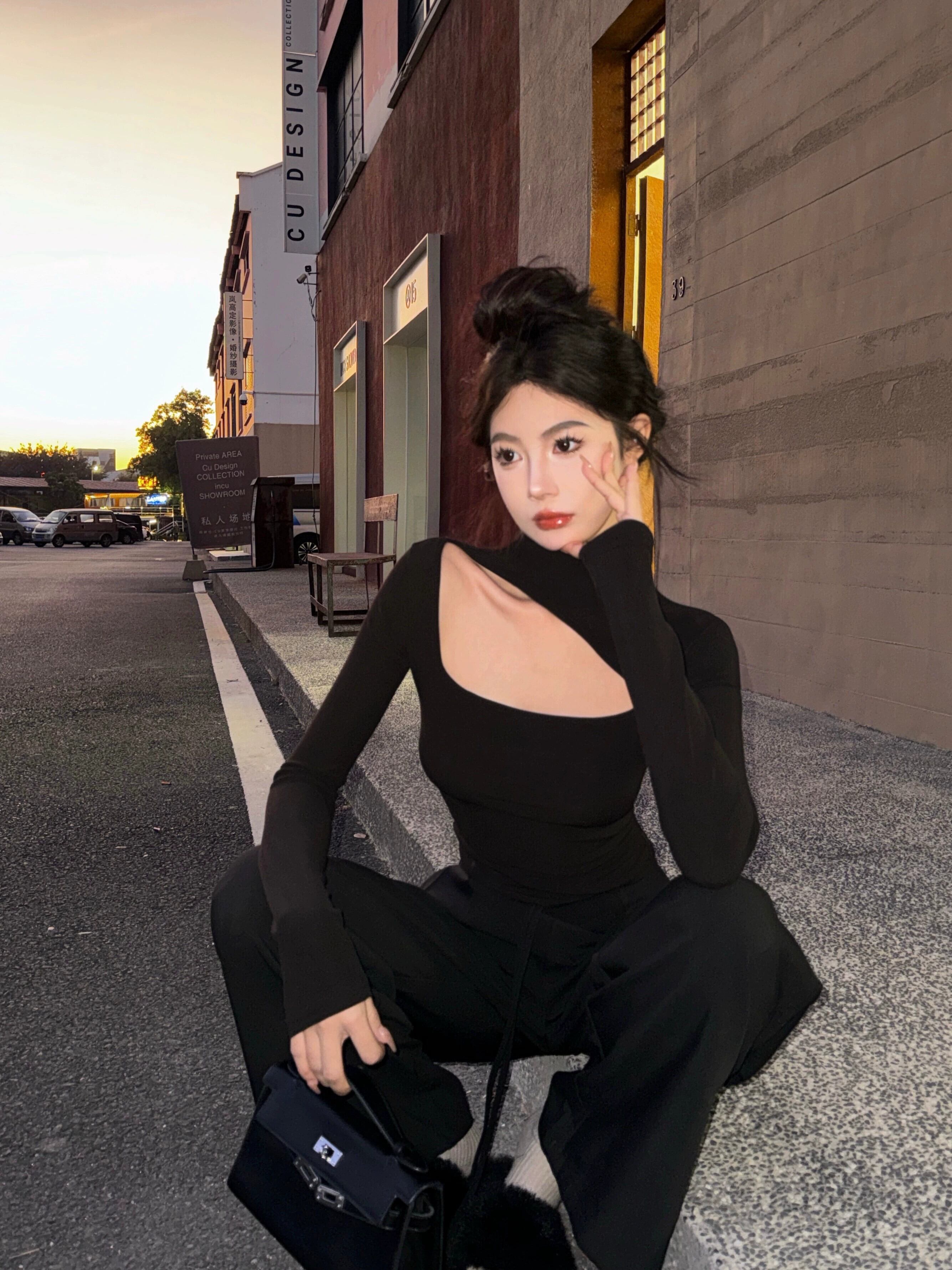 黒のハーフハイカラー中空 T シャツの女性の春の純粋な欲望痩身タイトな長袖ボトリング シャツとデザインのニッチ トップ ロング ブラック スプリング 春物 Tシャツ ピュア bstraw36898397385 | beaute25