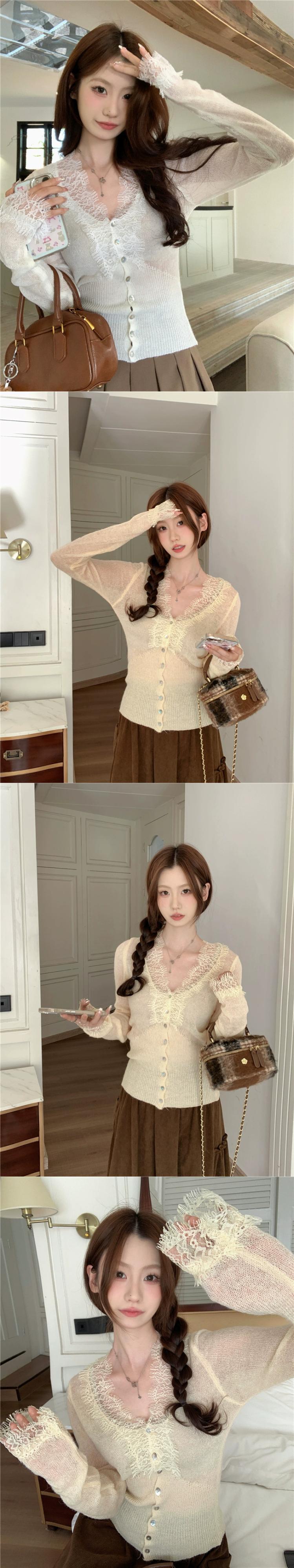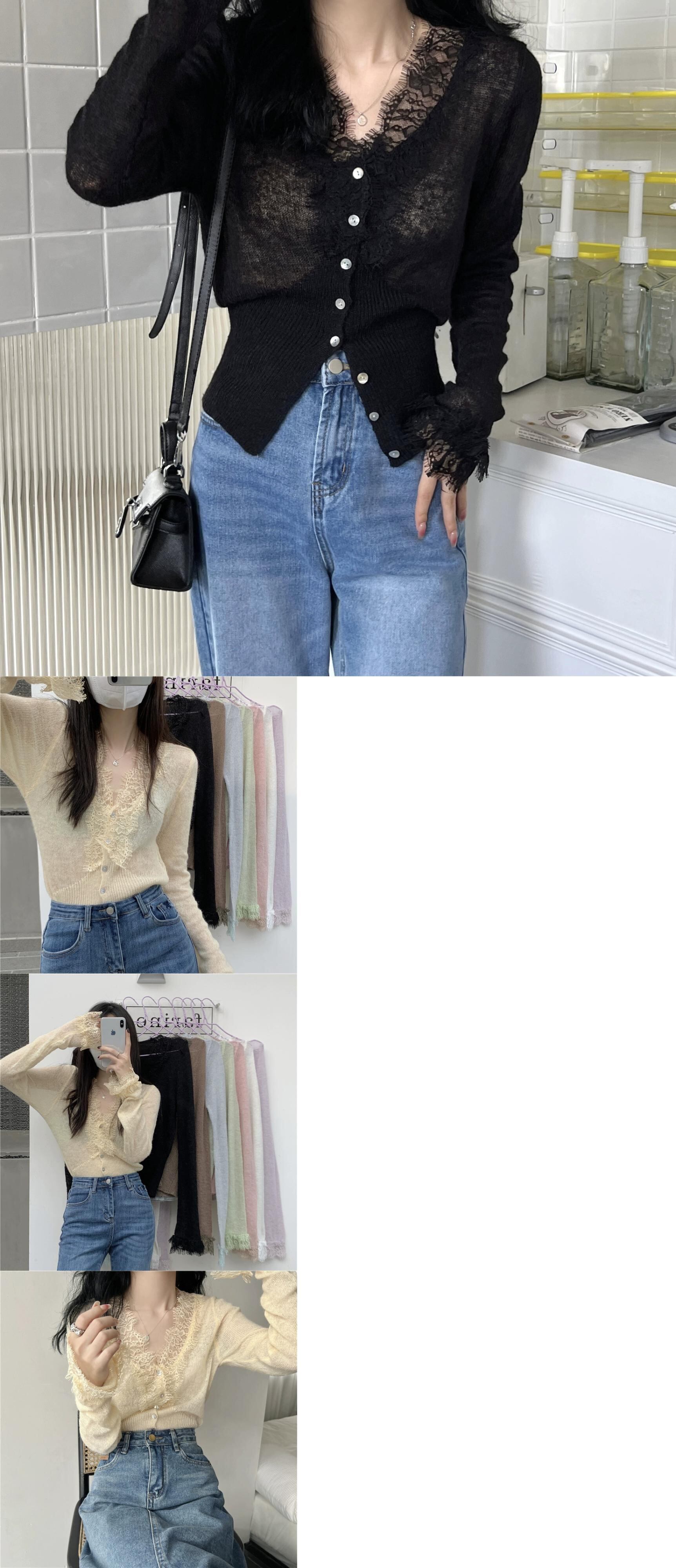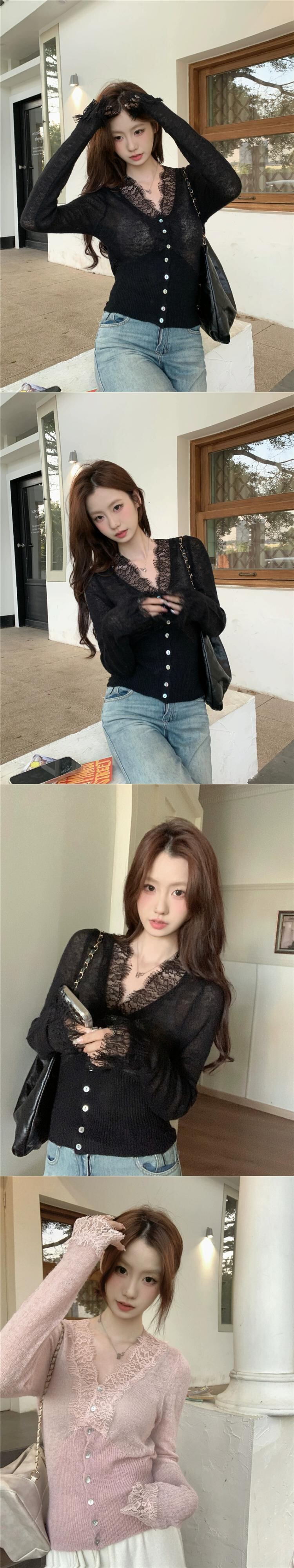 レース長袖 V ネックニットカーディガン女性春スリム黒インナーセーターショートボトミングシャツトップ ロング ブラック スプリング 春物 Vネック bstraw21919620505 | beaute25