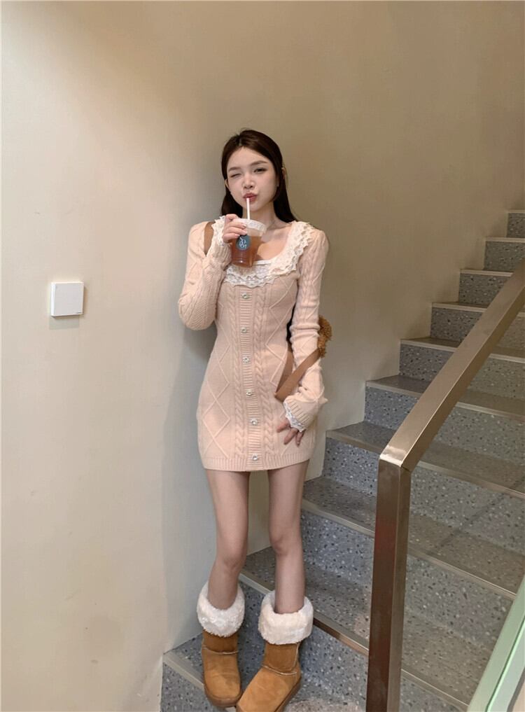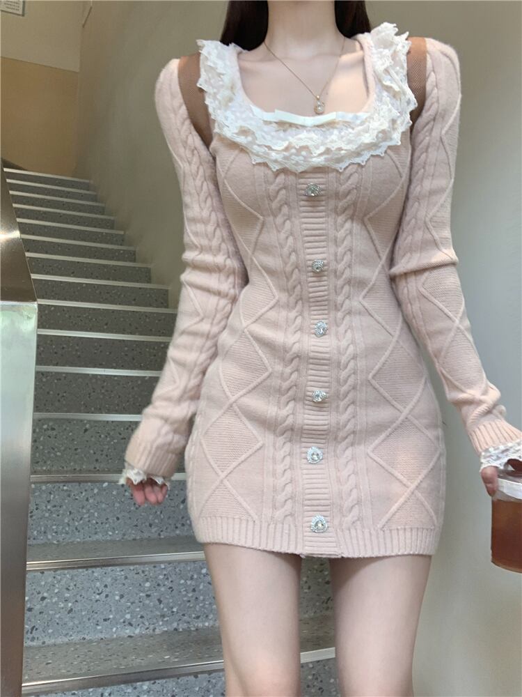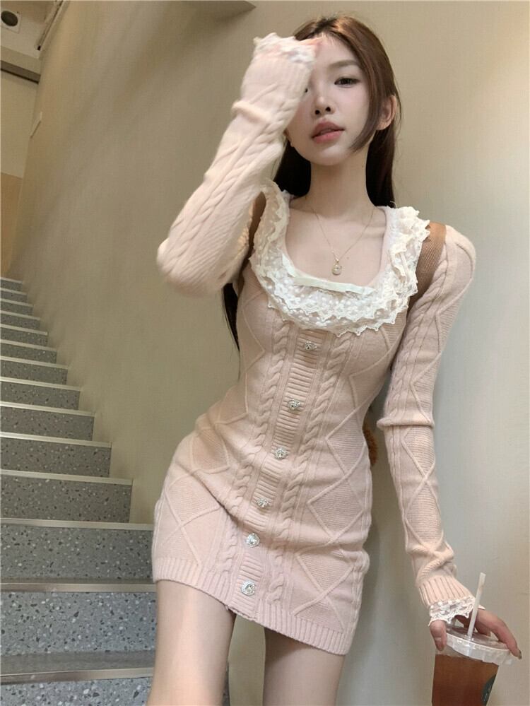 ピンクのレースの長袖ニットドレス女性春ウエスト抱きヒップセーター甘いショート A ラインスカート ロング 大人ガーリー スウィート キュート カジュアル スプリング 春物 Aライン bstraw72016278791 | beaute25