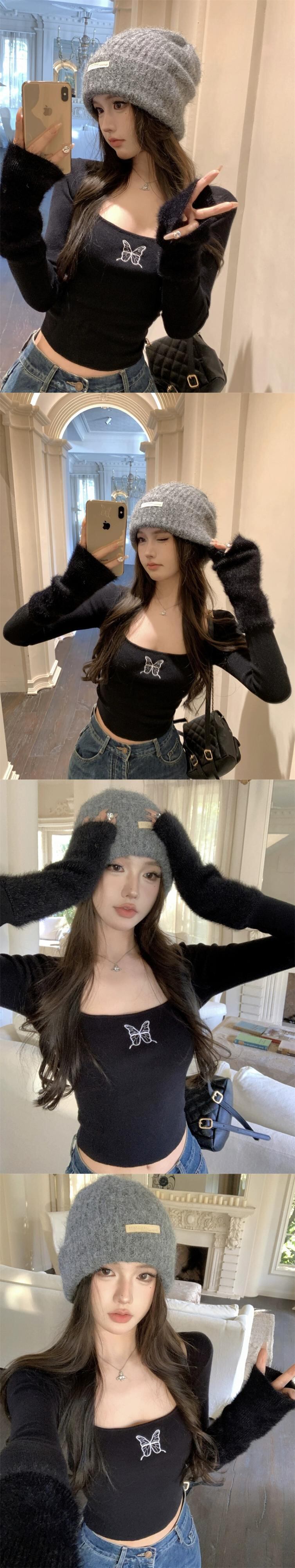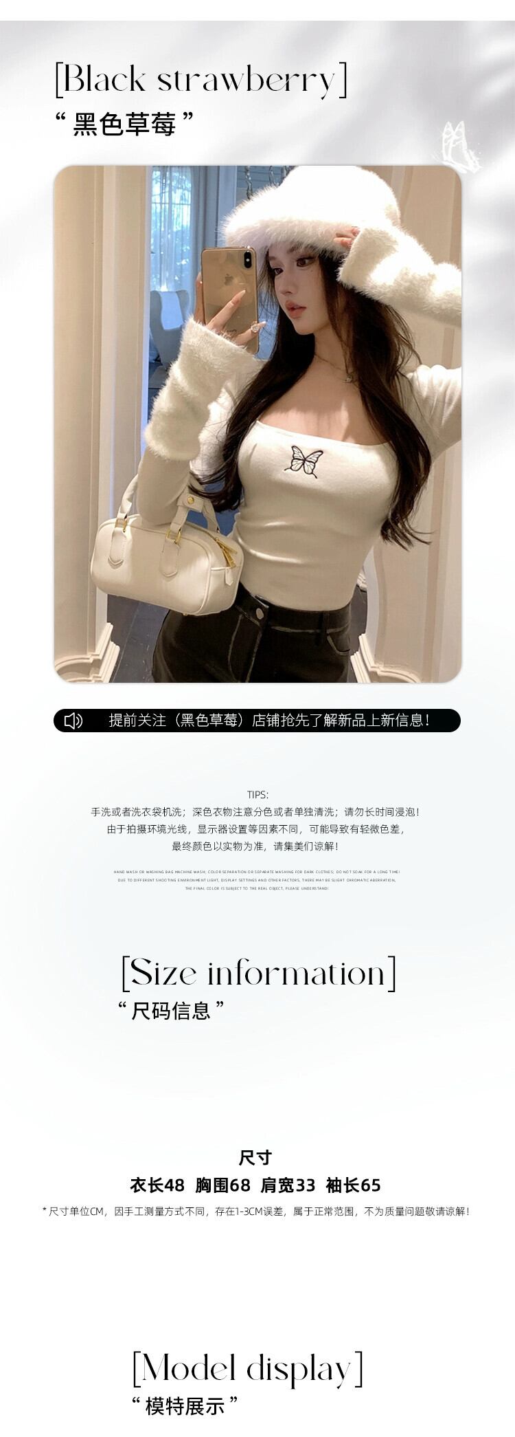 毛皮のような袖の蝶の刺繍のセーターの女性、正方形の襟が付いた春の白いセーター、スリムなショートボトムトップ ホワイト レッド スプリング 春物 スクウェア bstraw5272066605 | beaute25