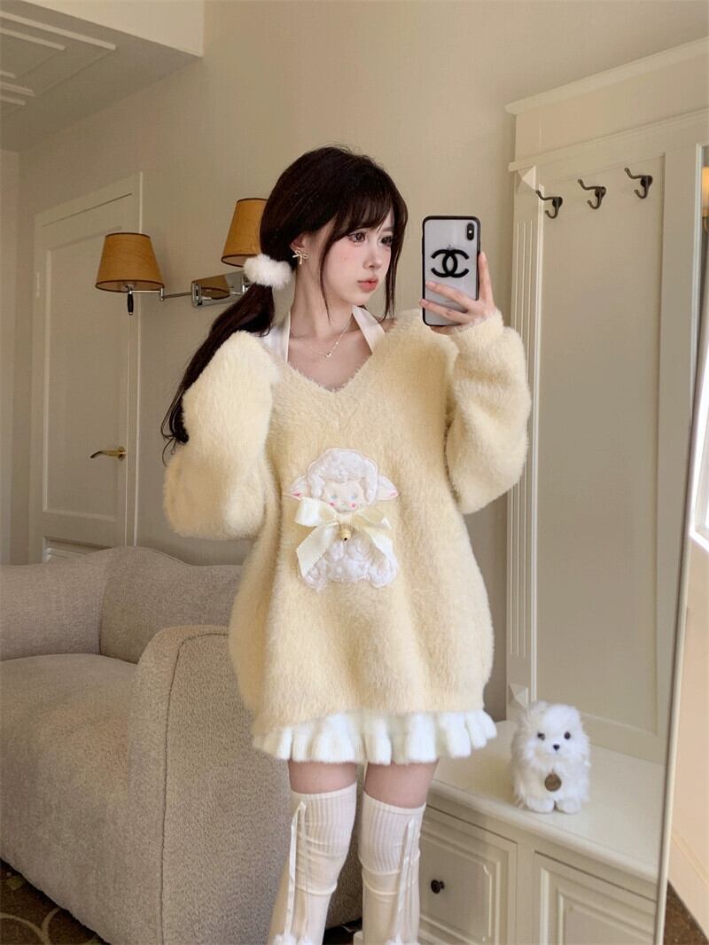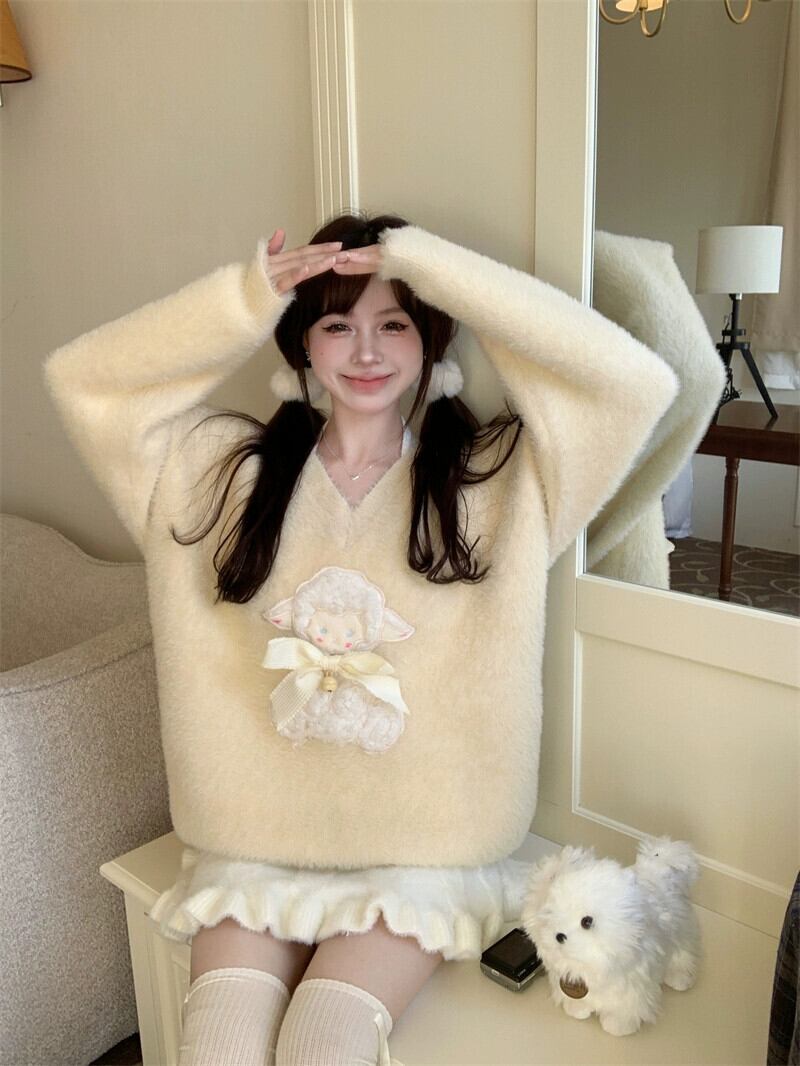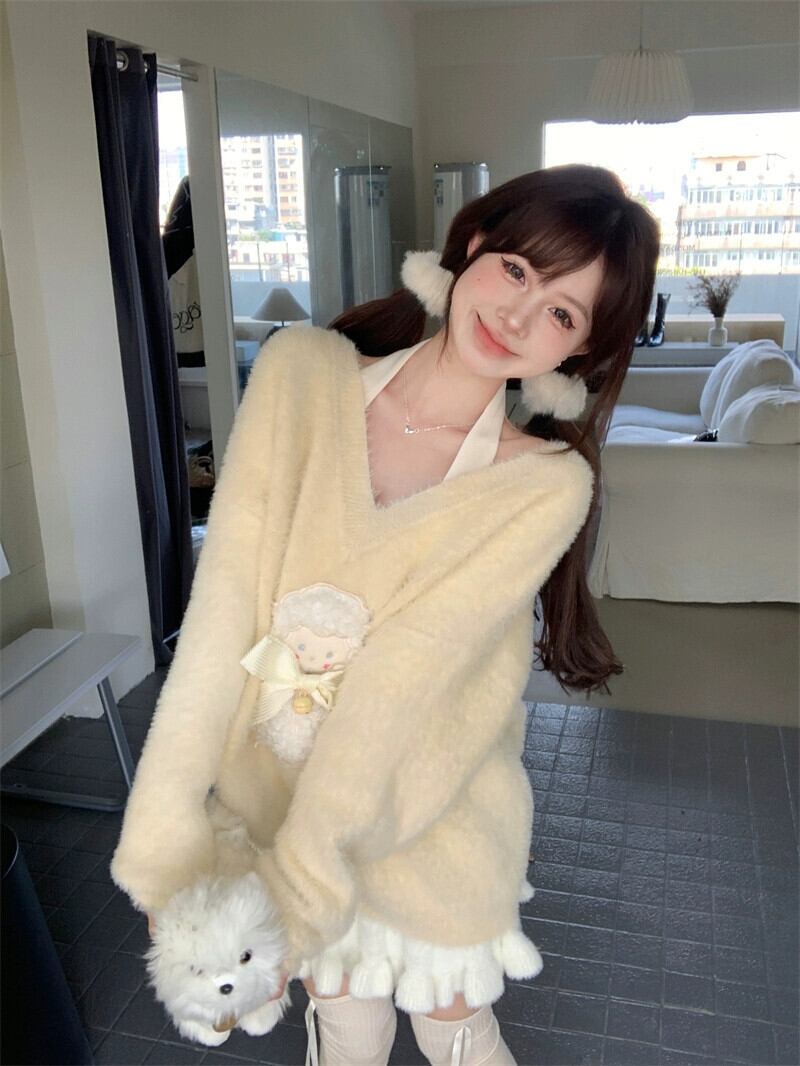 刺繍立体ラム V ネックセーター女性の春甘い怠惰なスタイルルーズ長袖プルオーバーセータートップ ロング レッド 大人ガーリー スウィート キュート カジュアル スプリング 春物 Vネック bstraw24512222977 | beaute25