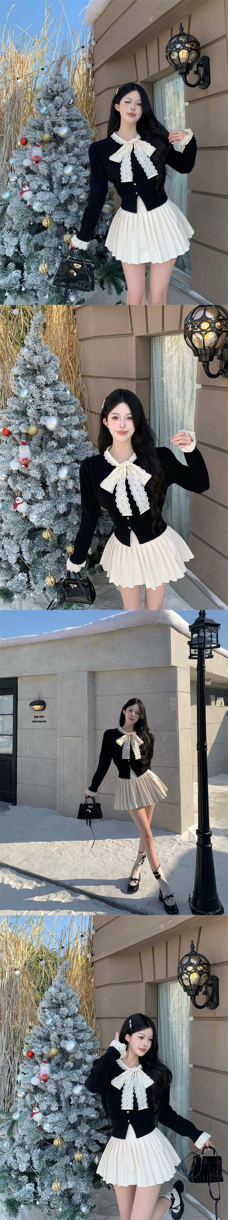 コントラストカラーレースリボンパフスリーブニットカーディガントップレディース春甘くて優しい長袖ウエストセーター ロング 大人ガーリー スウィート キュート カジュアル スプリング 春物 bstraw7272464561 | beaute25