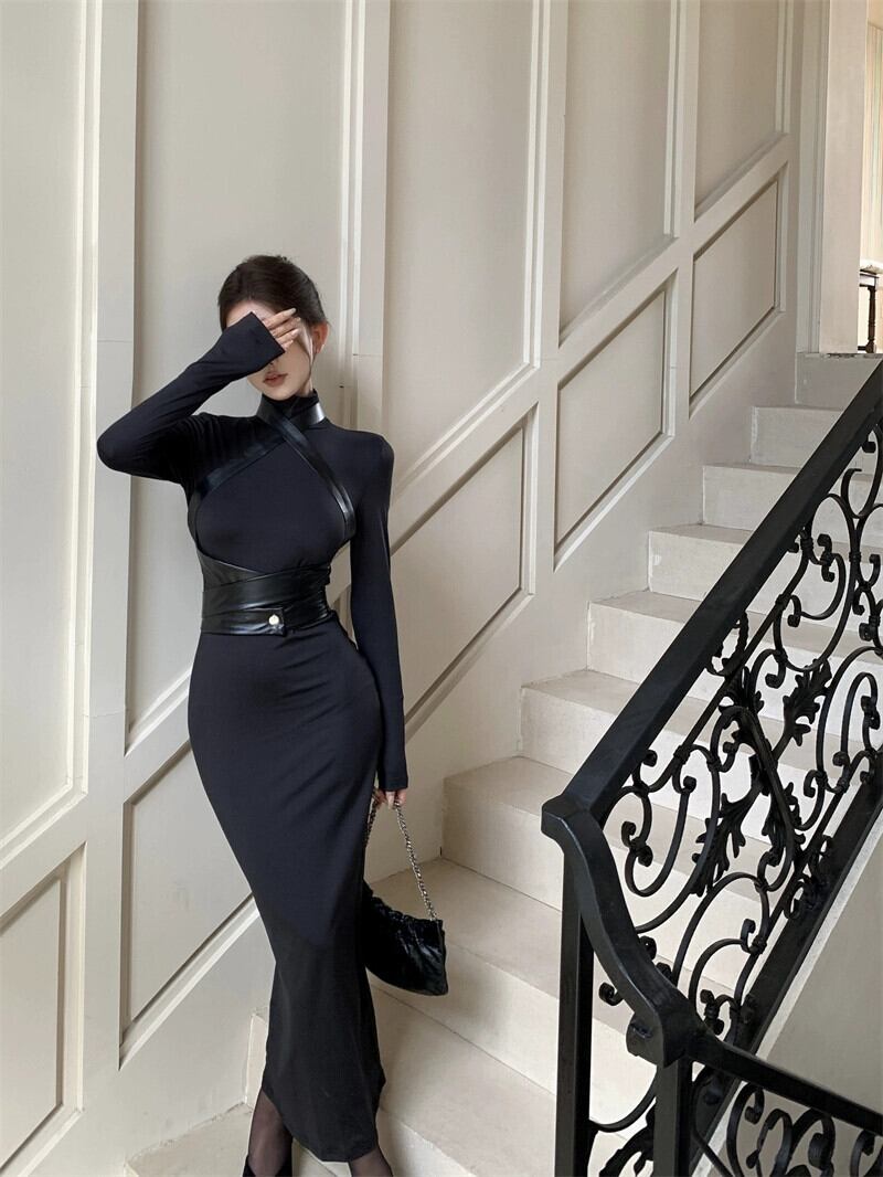 黒のスリムフィットハーフハイカラー長袖ドレスの女性の冬のウエストタイトなヒップハグスカート純粋な欲望のインナーミッドレングススカート ロング ブラック ウィンター 冬物 ピュア bstraw12774285907 | beaute25