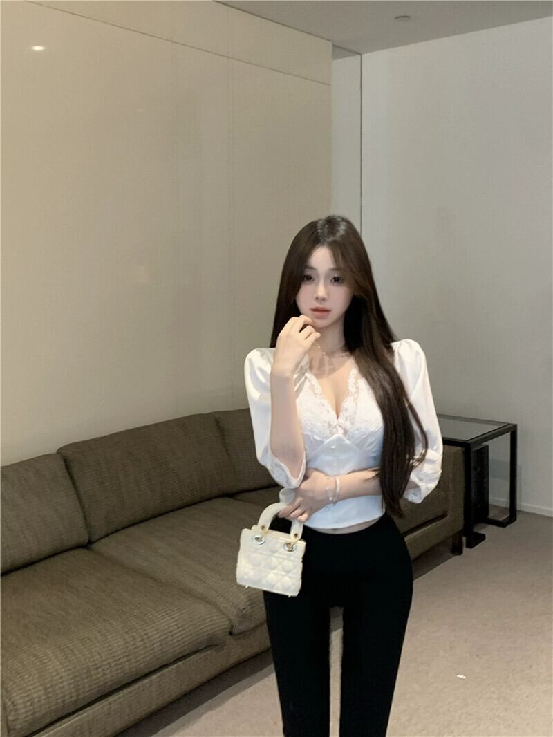 レーススプライシング V ネックサテンシャツレディース春フレンチスタイルハイエンドブラックシャツパフスリーブトップ スプリング 春物 Vネック bstraw18019298902 | beaute25