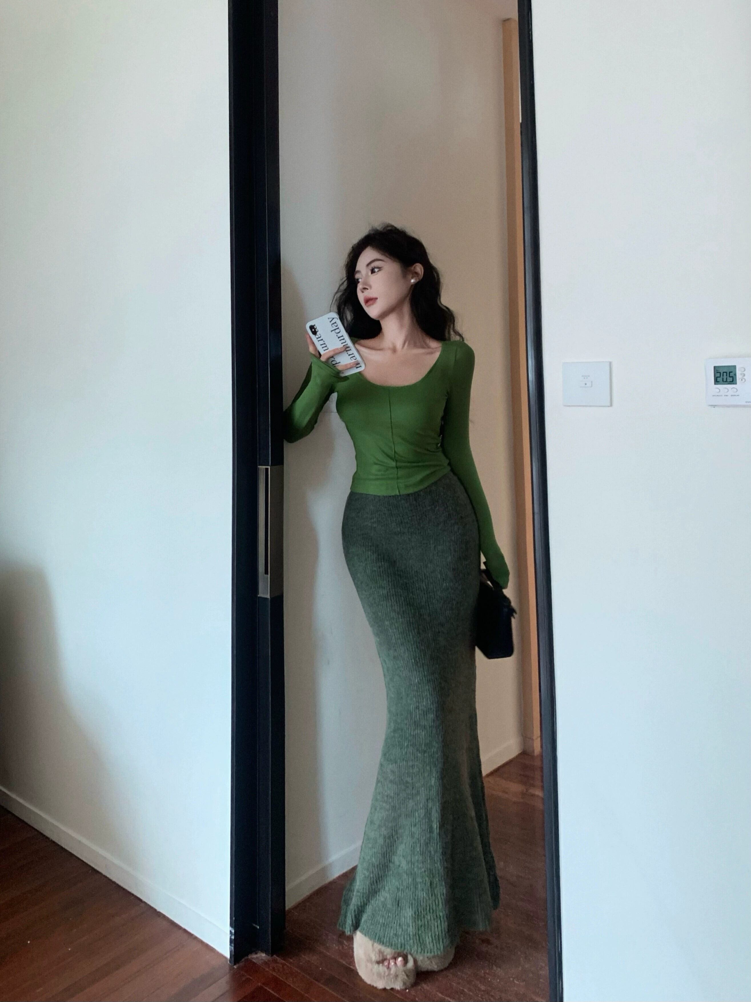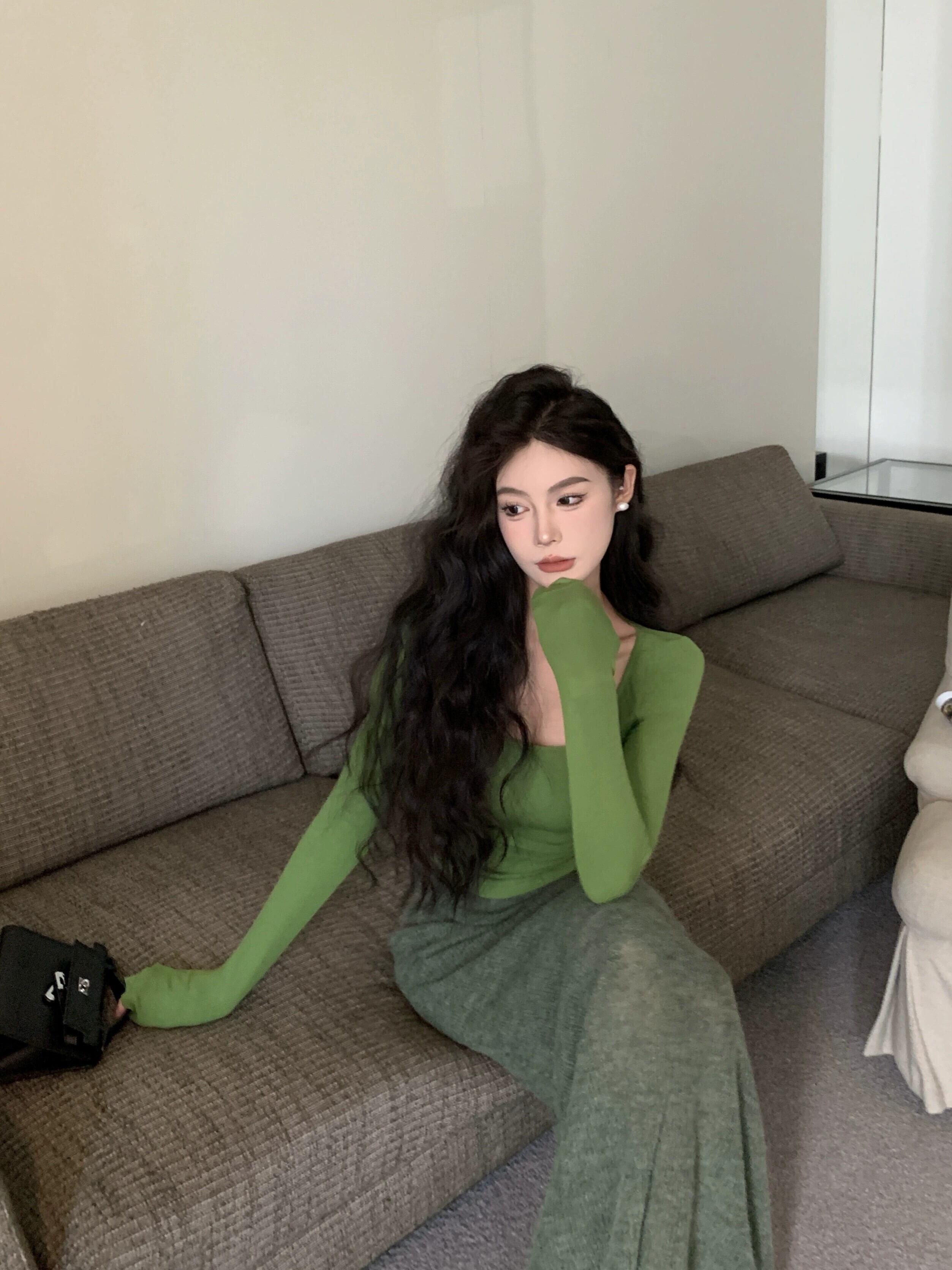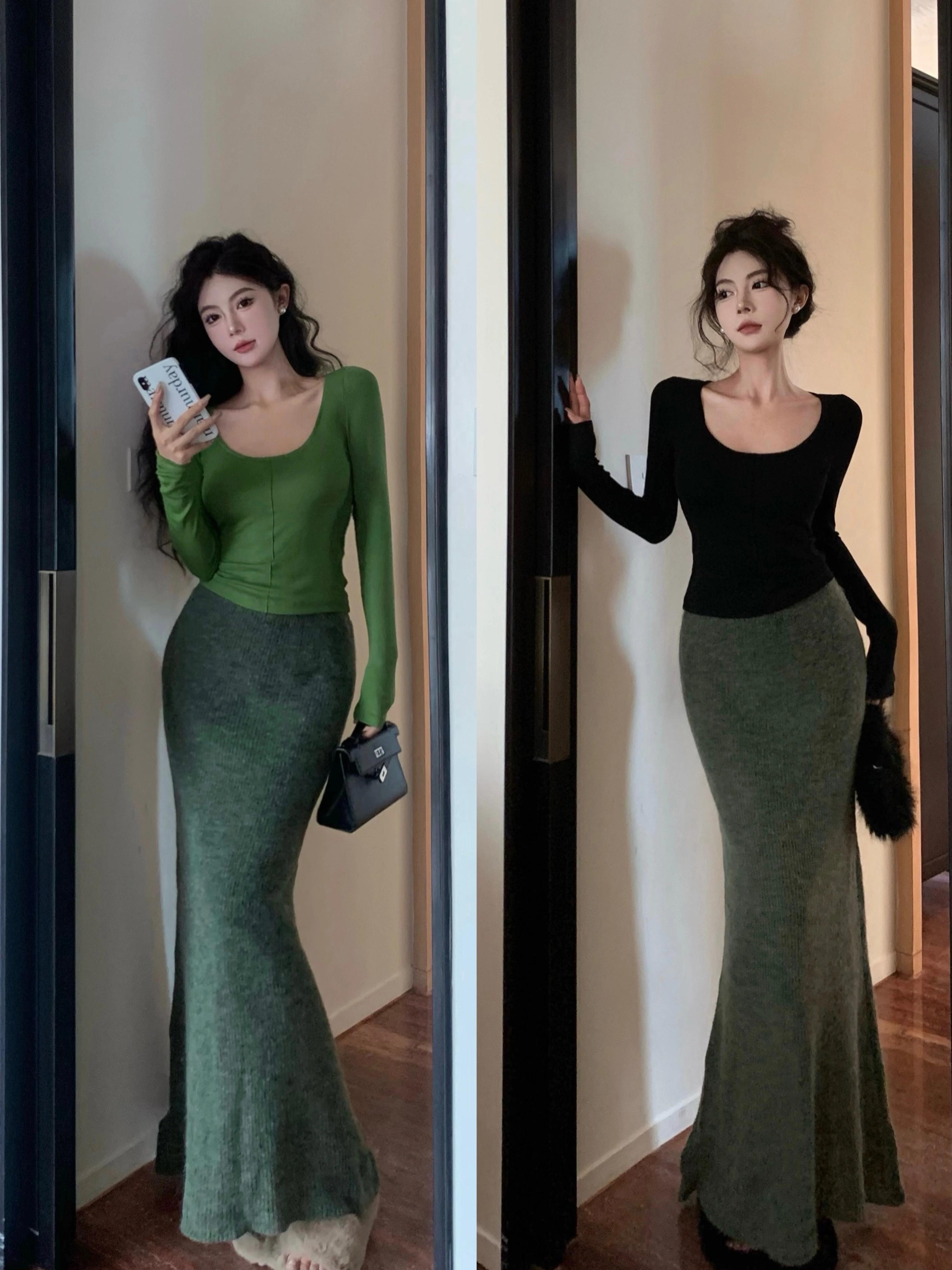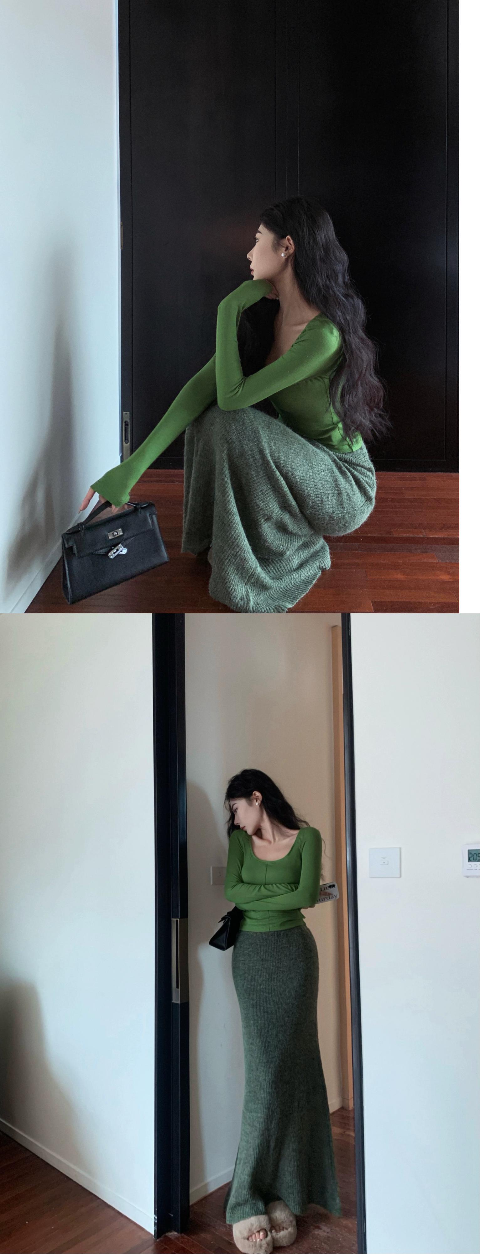 グリーンスリムスクエアネック長袖 Tシャツ女性の春ウエスト痩身純粋な欲望ショートスタイルシンプルなインナーボトリングシャツトップ ロング スプリング 春物 ピュア スクウェア bstraw71292960144 | beaute25