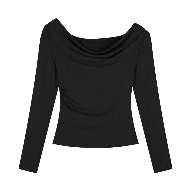 傾斜襟、オフショルダー、長袖 T シャツの女性、春のタイトフィット純粋な欲望スタイルのインナー レイヤリング シャツ、ショート、シックで美しいトップス ロング スプリング 春物 Tシャツ ピュア bstraw34135121427 | beaute25