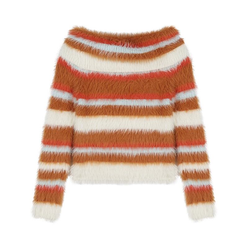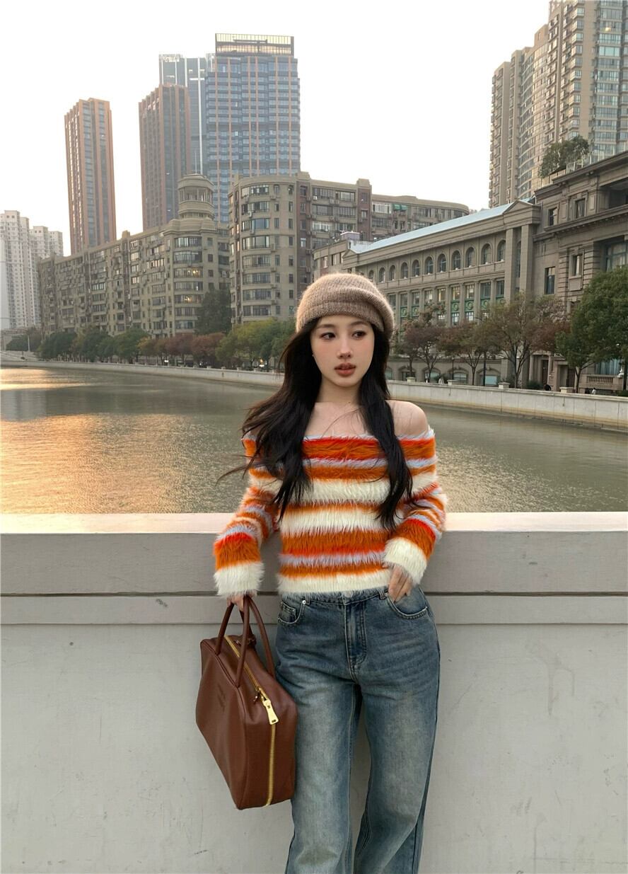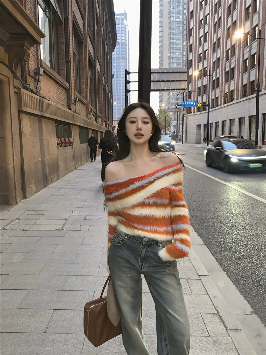 ワンショルダー カラフル ストライプ セーター レディース 春 スリム フィット レトロ ソフト ワックス ファー インナー セーター 長袖 トップ ロング スプリング 春物 bstraw30591261753 | beaute25
