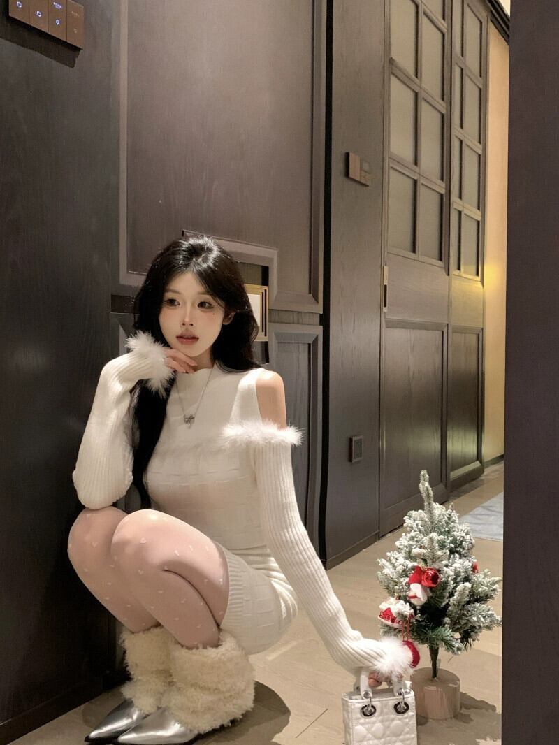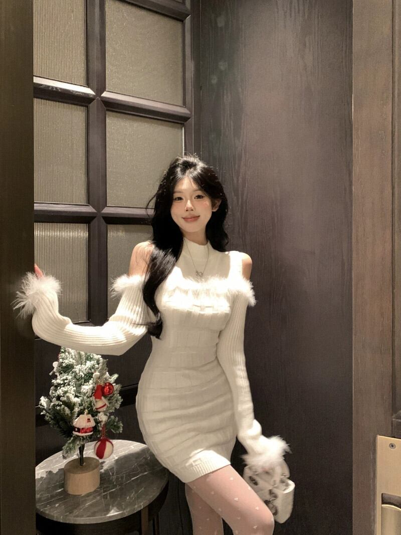 春の白いオフショルダーのニットドレス、毛皮のようなスプライシング、長袖のインナースカート、純粋な欲望のタイトなヒップハグショートスカート ロング ホワイト スプリング 春物 ピュア bstraw64013452410 | beaute25