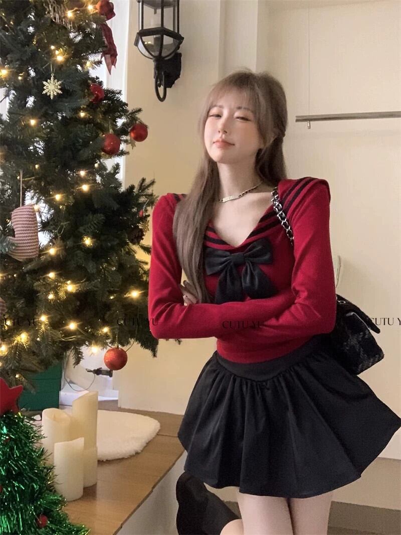 弓赤底シャツネイビーカラー長袖 Tシャツ女性春純粋な欲望スリムフィットインナーショートウエストトップ ロング レッド スプリング 春物 ピュア bstraw67256199451 | beaute25