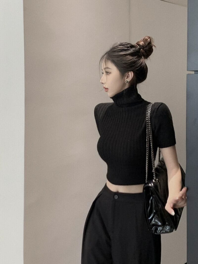 グレーのタートルネック、右肩、半袖セーター女性、春アウター、スリムフィットインナー、ぴったりフィットのへそ出しショートトップス スプリング 春物 bstraw26177578075 | beaute25