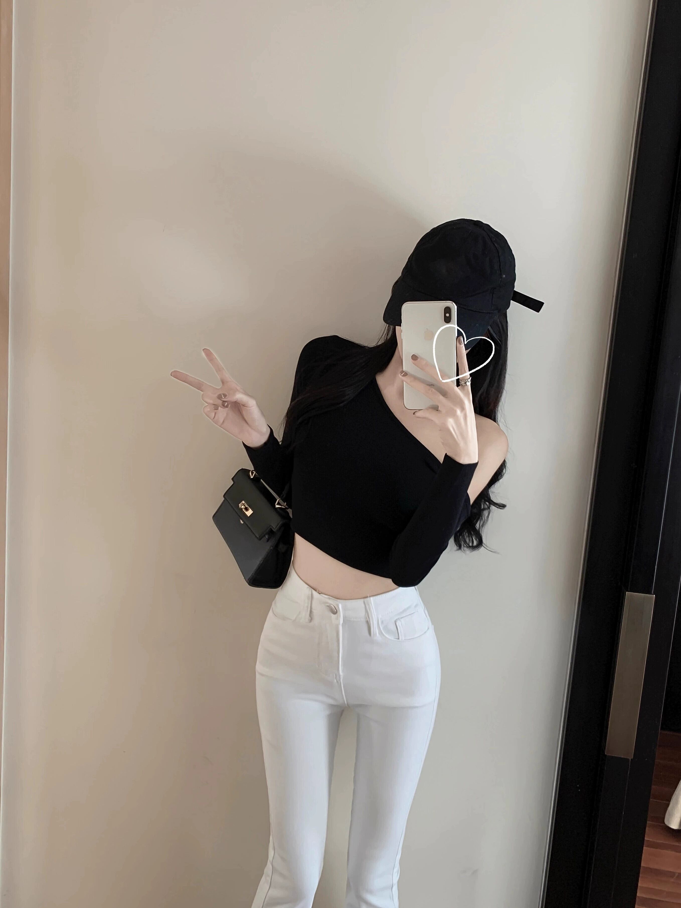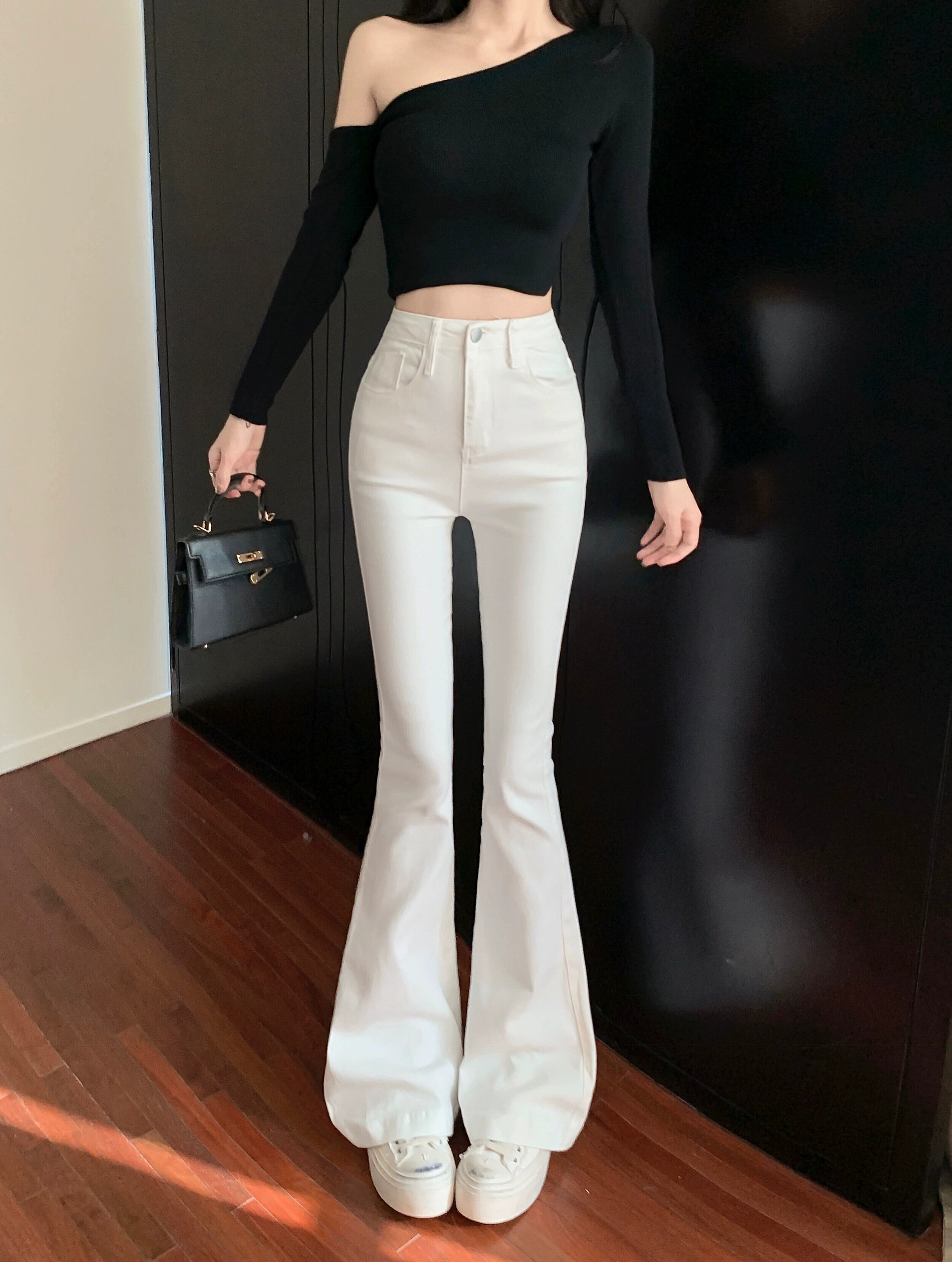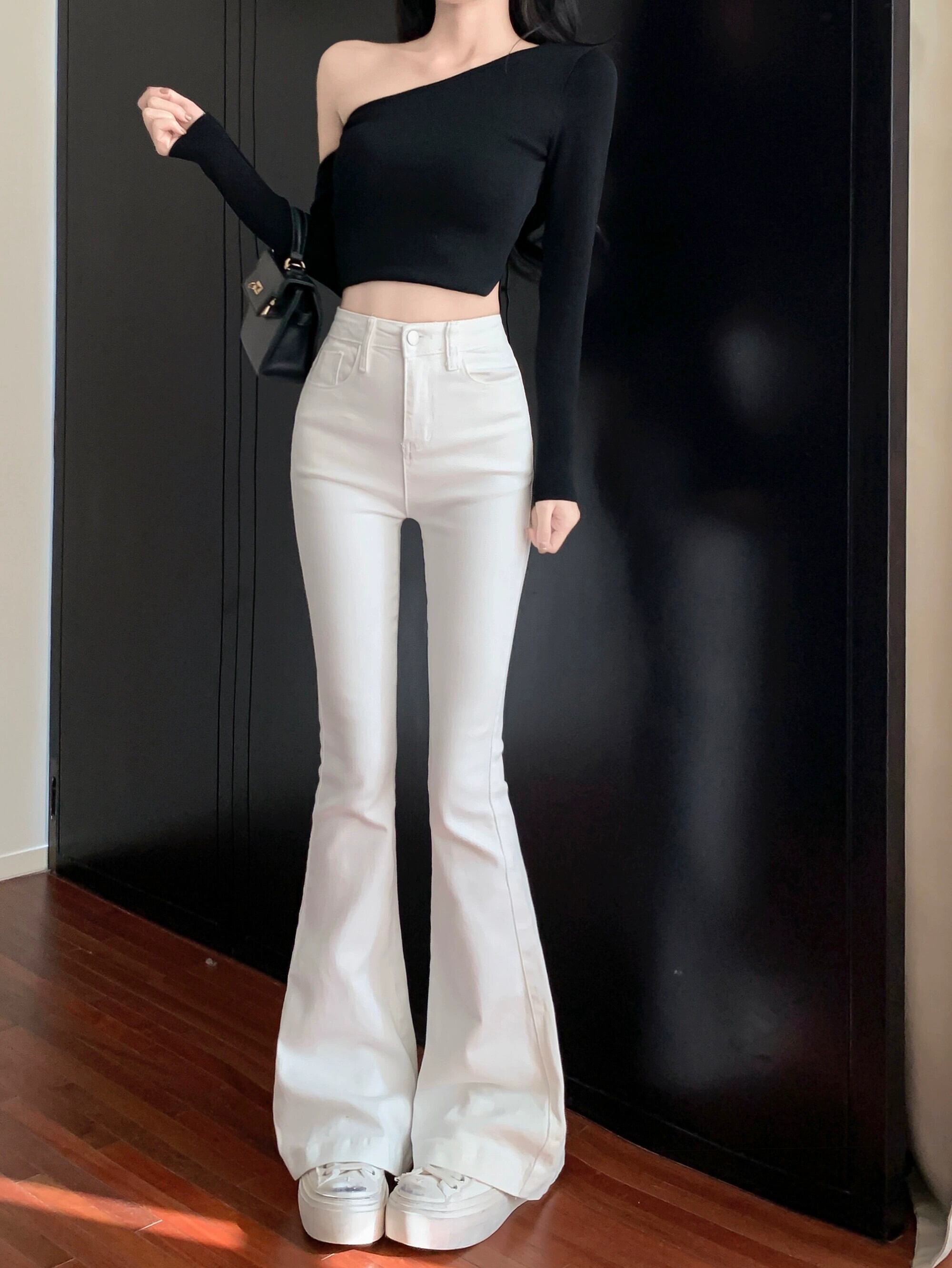 ホワイト マイクロ フレア ジーンズ レディース、スプリング デザイン ハイウエスト ストレッチ スリム フィット パンツ、ストレートレッグ フロアレングス ホースシュー パンツ 春物 bstraw46051353087 | beaute25