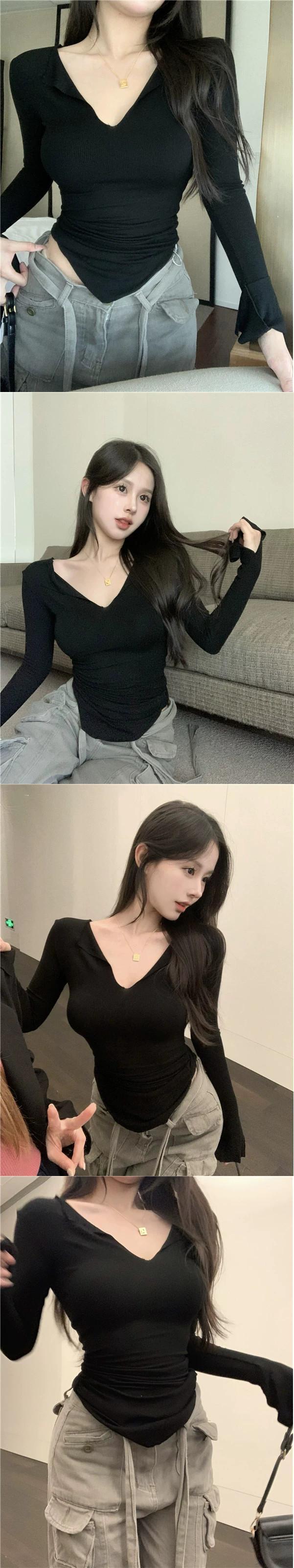 純粋な欲望スタイル紫 V ネック長袖 Tシャツ女性の春の新セクシーなウエストタイトなインナーボトリングシャツトップ ロング スプリング 春物 Vネック パープル bstraw95588722779 | beaute25