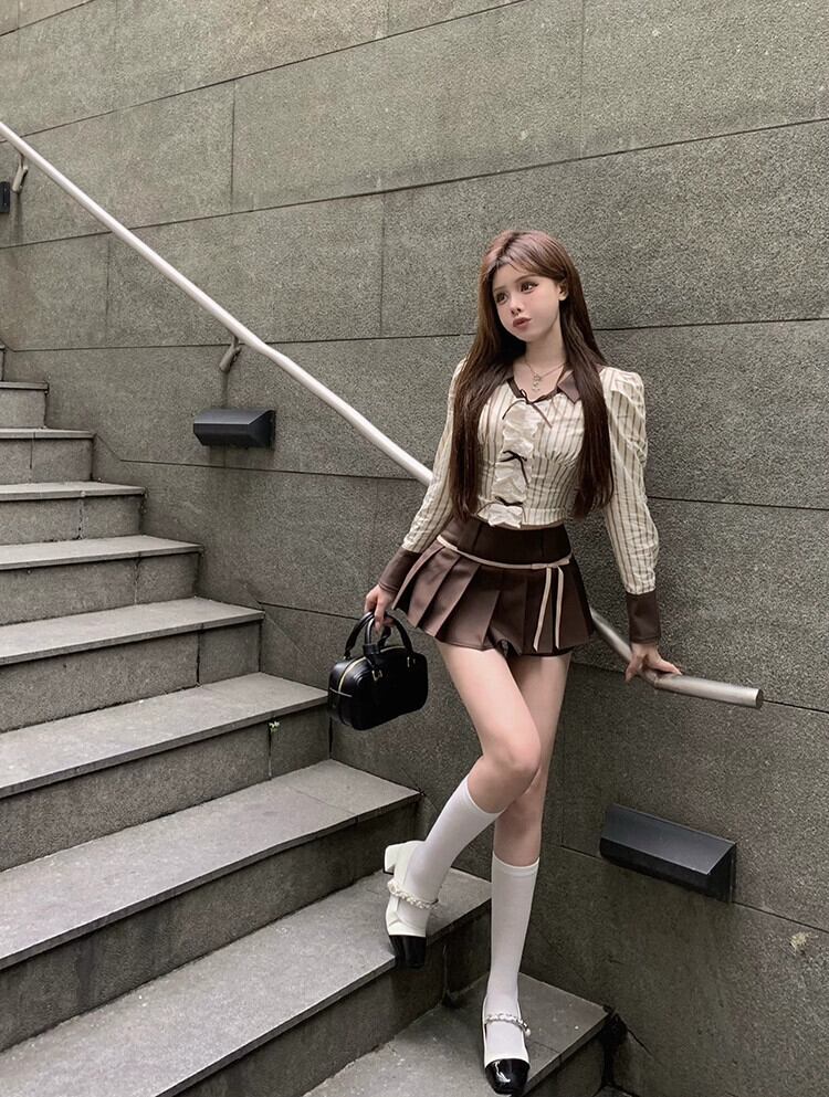 色:ベージュのストライプシャツ,ダークブラウンのキュロット