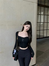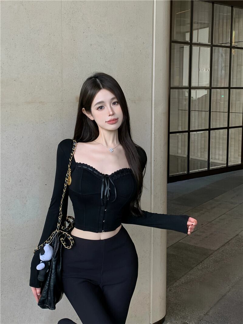 黒のスクエアネック長袖 T シャツの女性の春の純粋な欲望ショート インナー レイヤード シャツ レース超表示フィギュア トップ ロング レッド ブラック スプリング 春物 Tシャツ ピュア スクウェア bstraw81272217522 | beaute25