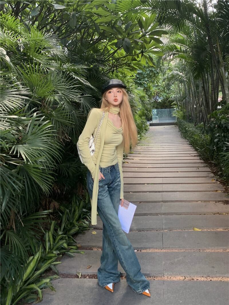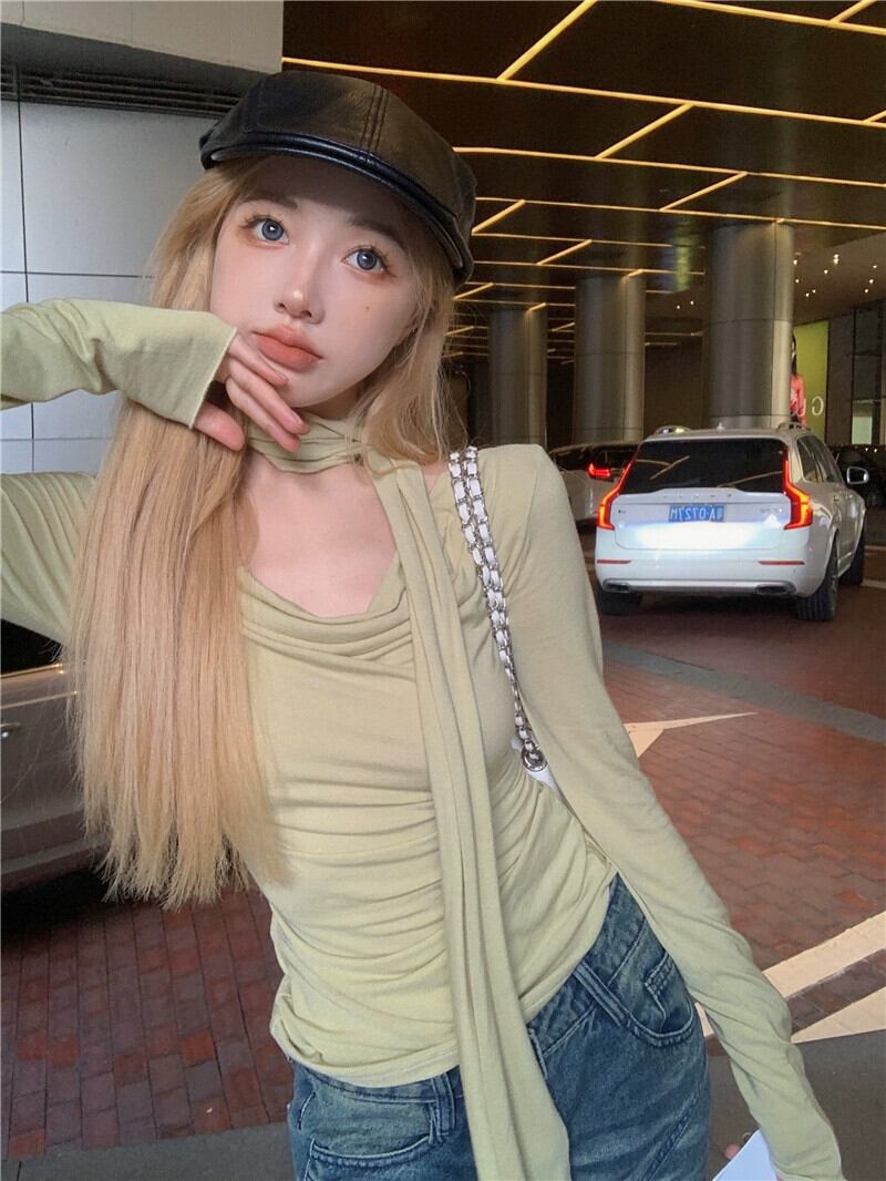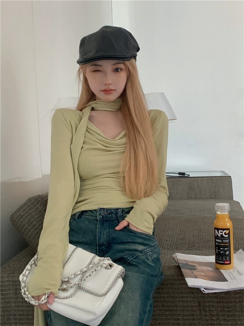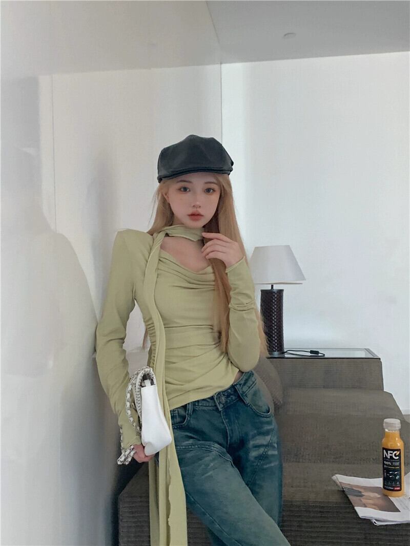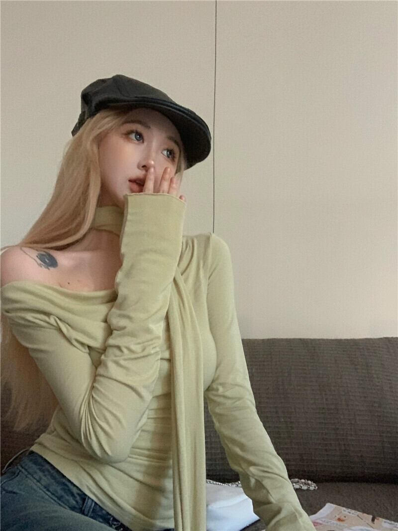 Pure Desire スイングカラー長袖右肩 Tシャツレディース春スリムフィットボトリングシャツユニークでシックなストラップトップ ロング スプリング 春物 bstraw93941178287 | beaute25