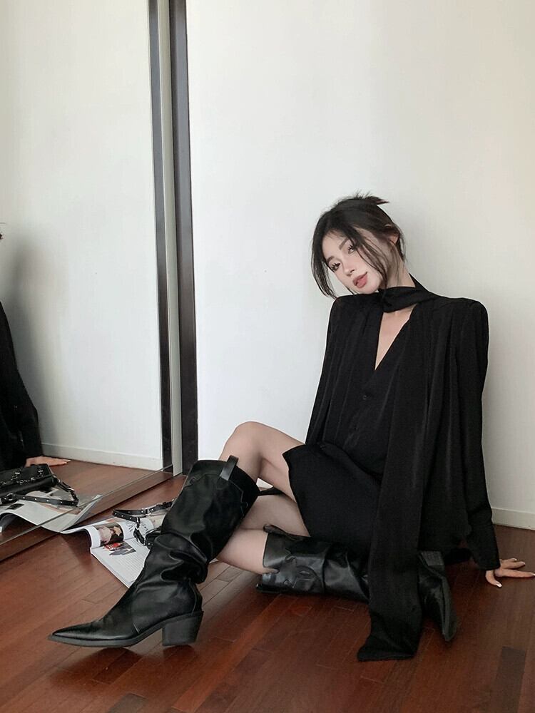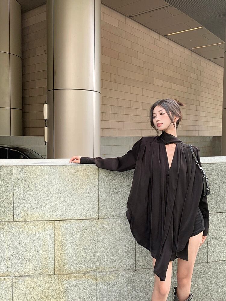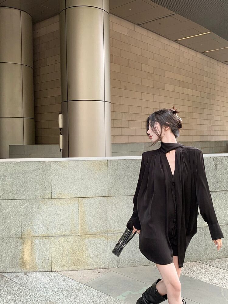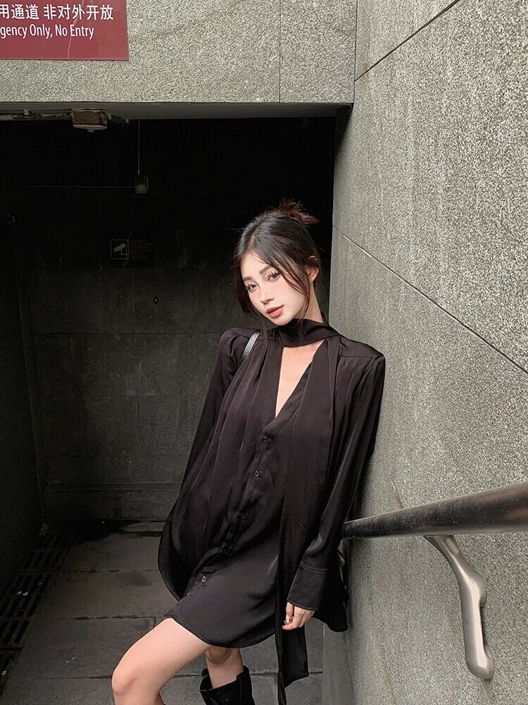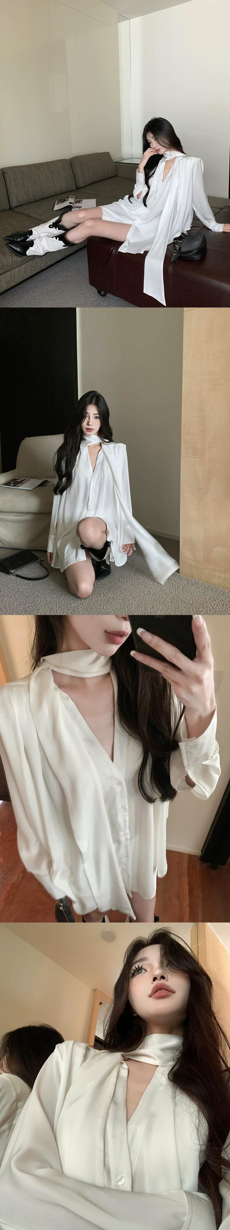 白い V ネックリボンシャツドレス女性春肩パッド入り長袖シャツデザインニッチルーズミッドレングストップ ロング ホワイト スプリング 春物 Vネック bstraw80129309551 | beaute25