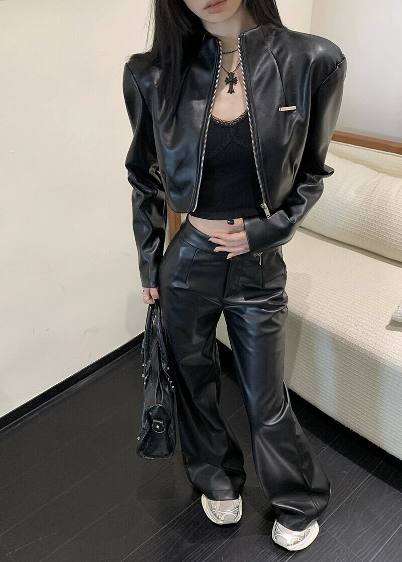 -end バイクネクタイスーツ レザージャケット ショートコート レディース 秋冬 ワイドパンツ レザーパンツ ブラック 2点セット オータム 秋物 ウィンター 冬物 bstraw89838856326 | beaute25