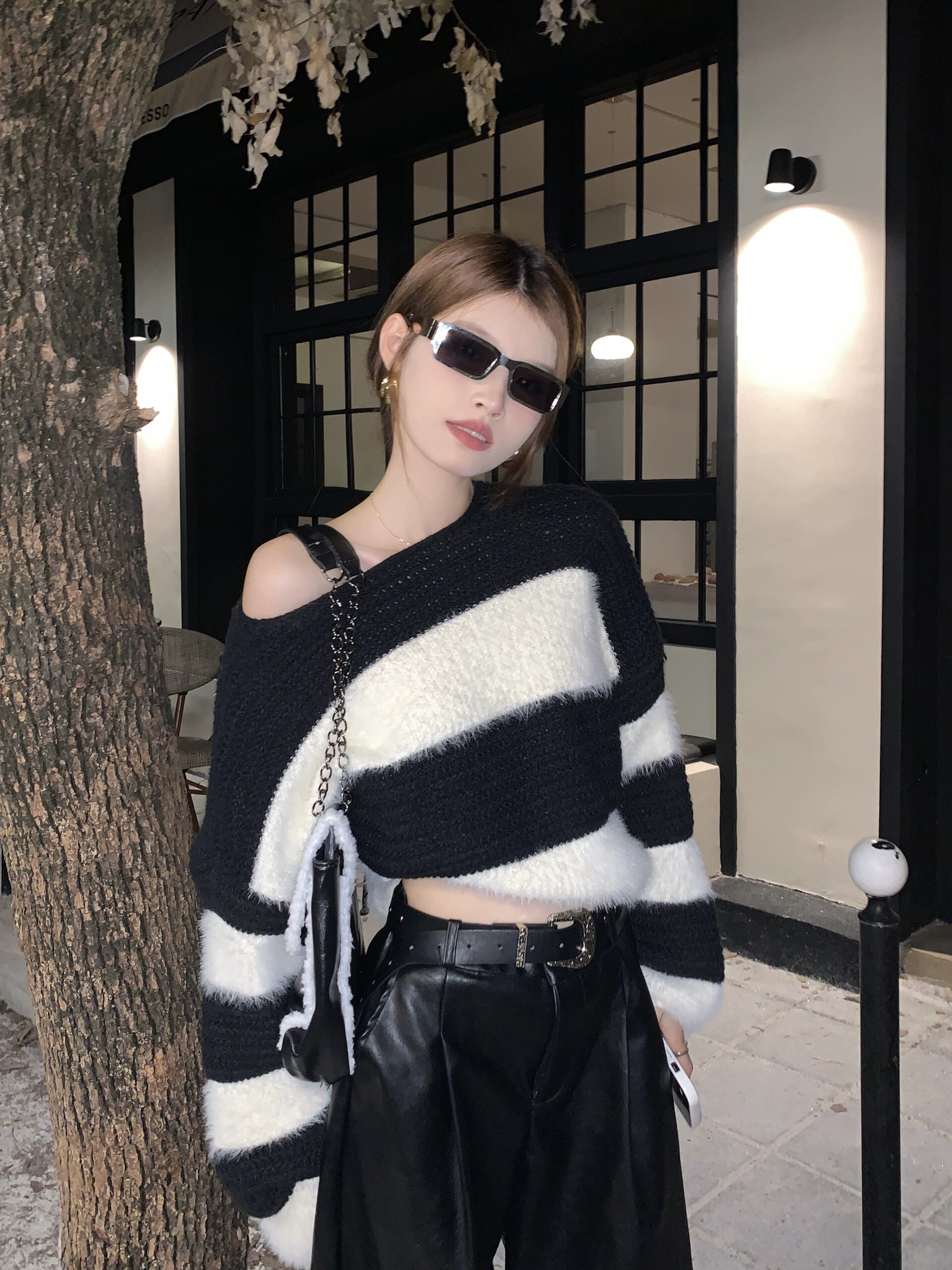 モヘアストライプラウンドネックセーター女性の春レトロルースソフトワックスプルオーバーセーター長袖ショートトップ ロング スプリング 春物 Oネック bstraw99420763234 | beaute25