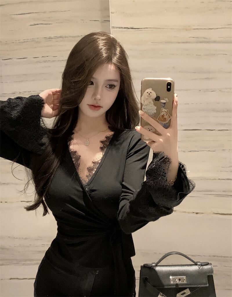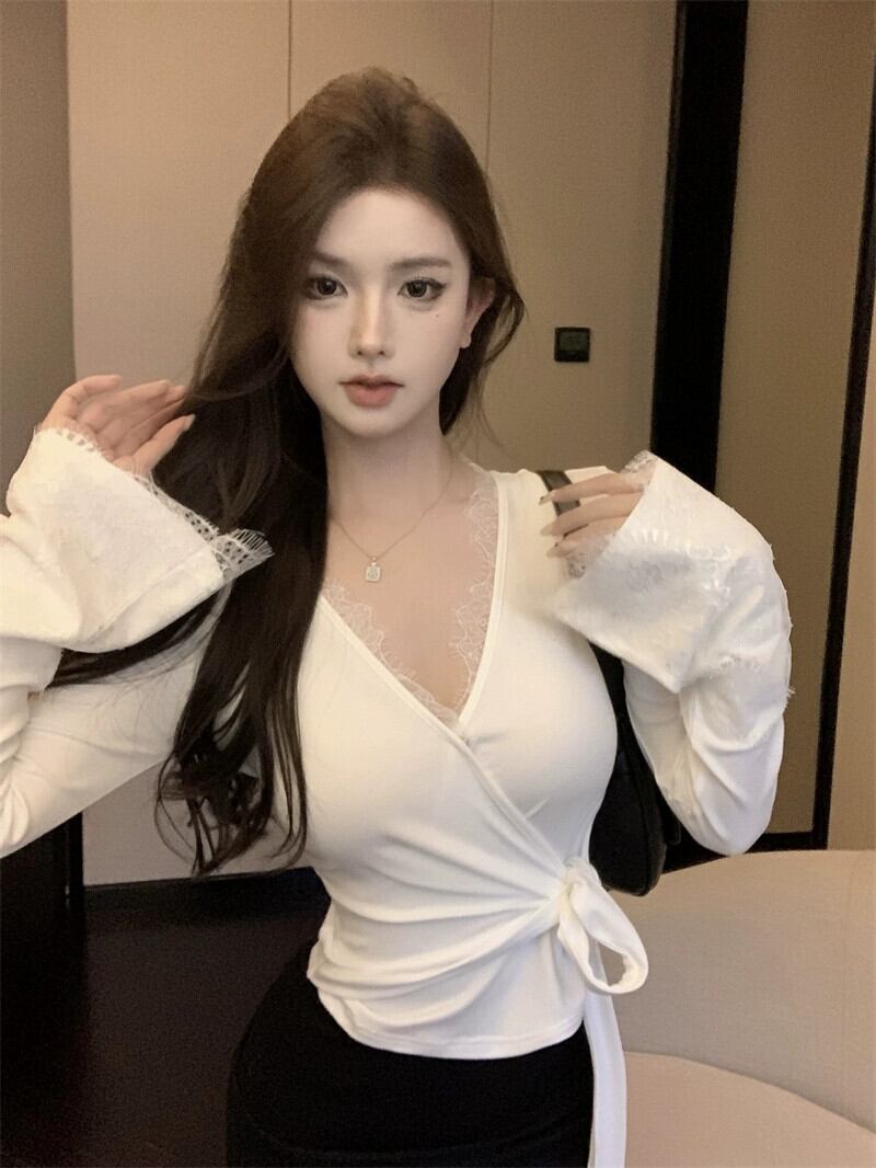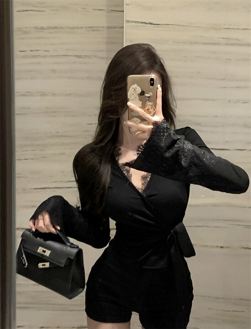 黒の V ネックレーススプライシングストラップ Tシャツ女性春ウエストタイトなセクシーな長袖インナーレイヤードシャツトップ ロング レッド ブラック スプリング 春物 Vネック bstraw45129026302 | beaute25