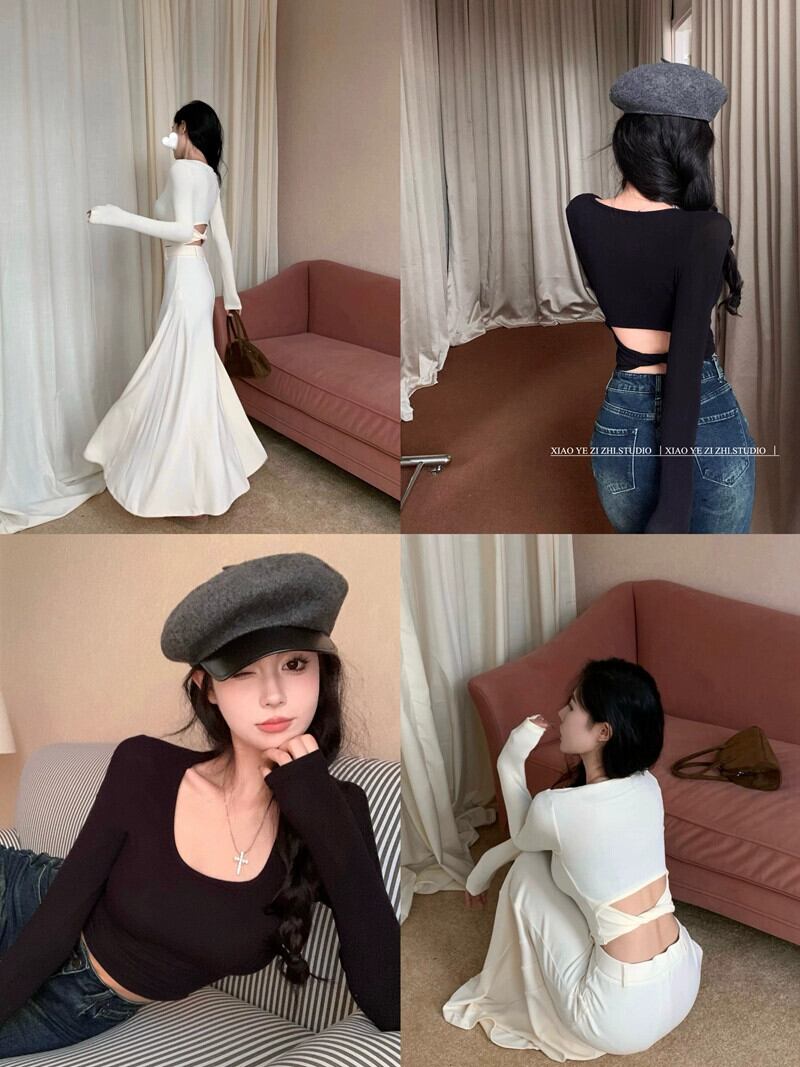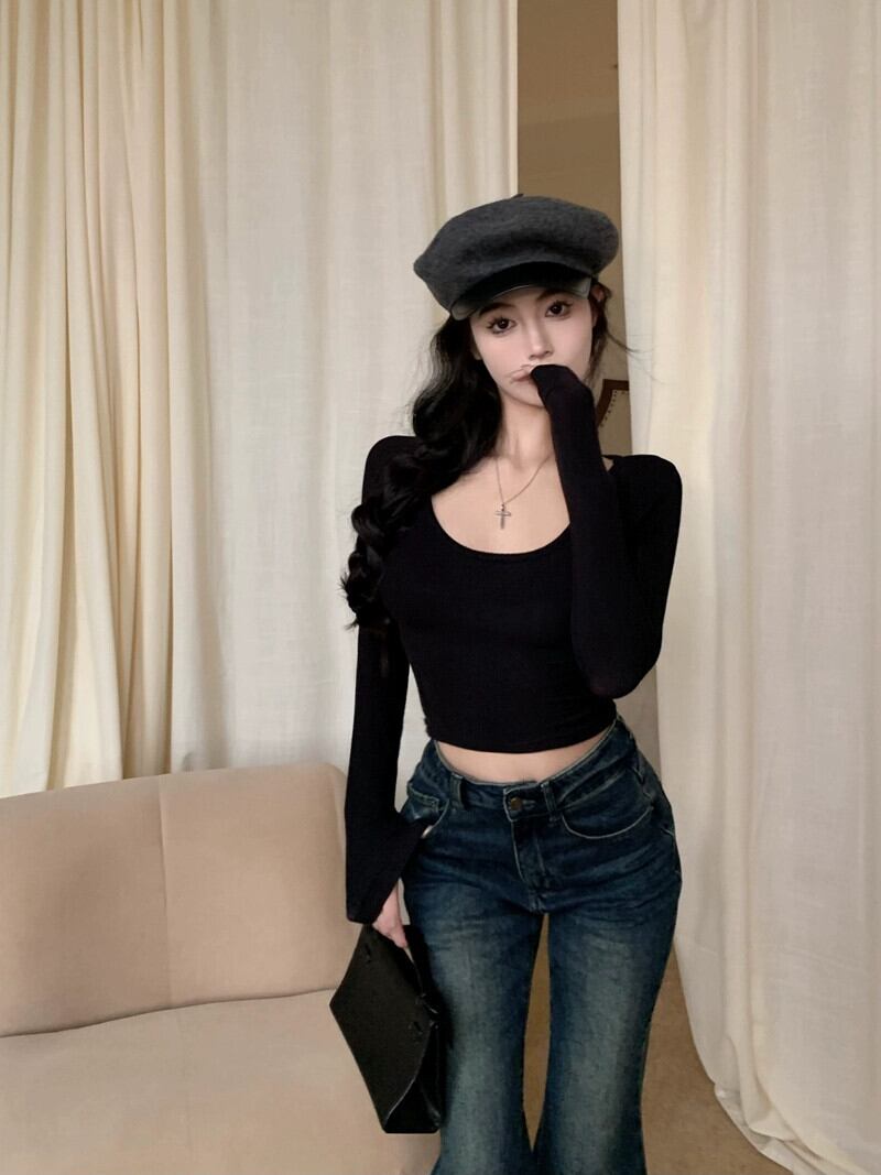 機械の背中に注意してください中空長袖 T シャツ女性春黒スリムフィットショートインナーボトリングシャツデザイントップ ロング ブラック スプリング 春物 Tシャツ bstraw90515947430 | beaute25