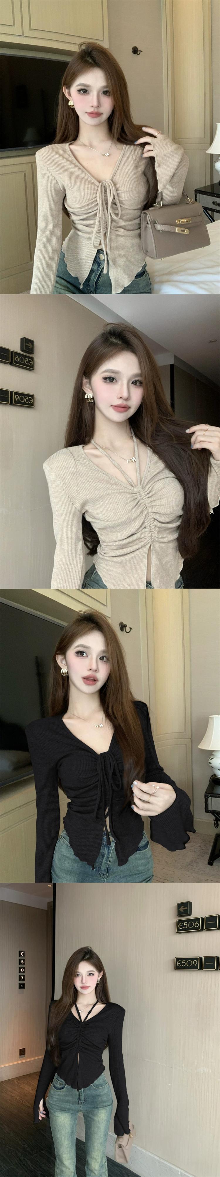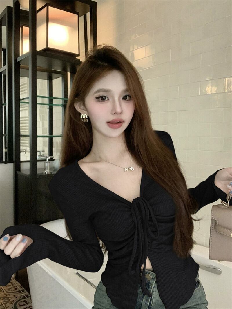 赤い巾着ストラップ V ネック長袖セーター女性春のウエストラインと不規則なショート ボトム トップ ロング レッド スプリング 春物 Vネック bstraw16035085718 | beaute25