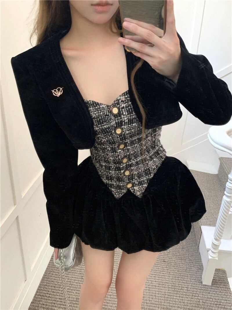 長袖ショートジャケット、小さな香りのサスペンダートップ、女性の初春の気質のスーツ、ベルベットの五分丈の短いスカート、3点セット ロング スプリング 春物 bstraw90628665896 | beaute25