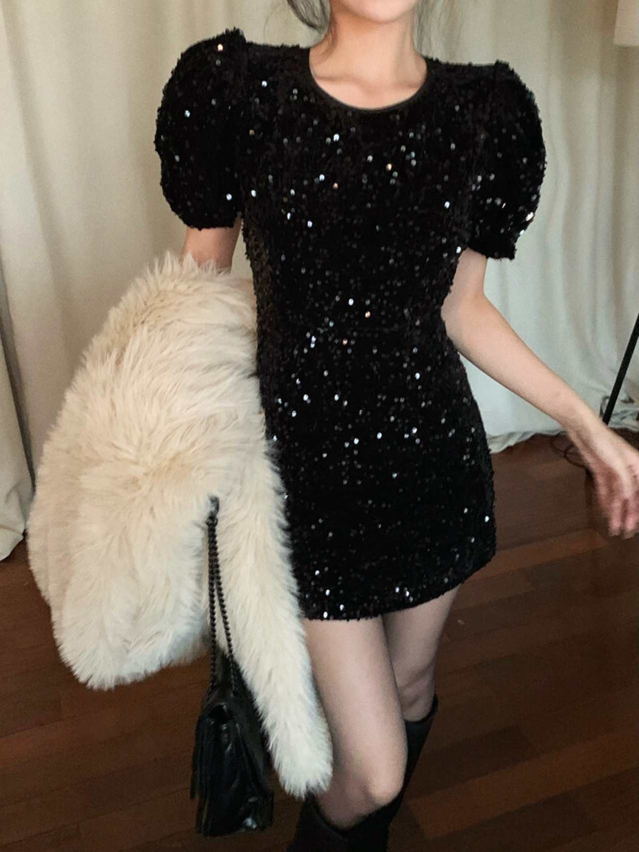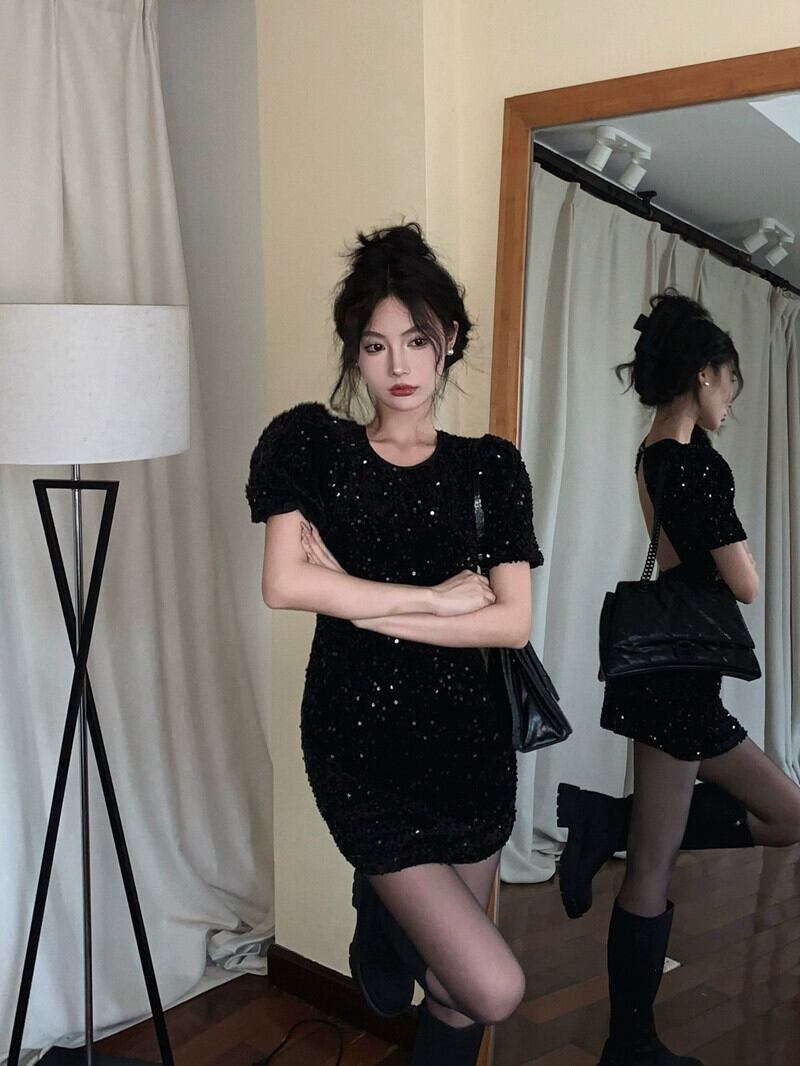 ブラック スパンコール デザイン バックレス パフ スリーブ ドレス レディース 春 ウエストを締める A ライン スカート ピュア ラスト ヒップハグ スカート スプリング 春物 Aライン bstraw56126968204 | beaute25
