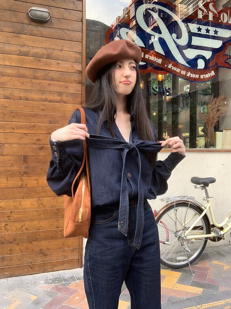 香港風レトロデニムスーツボウシャツトップレディース春先ハイウエストややフレアパンツズボン2点セット ハイウェスト レッド リボン スプリング 春物 bstraw24698143382 | beaute25