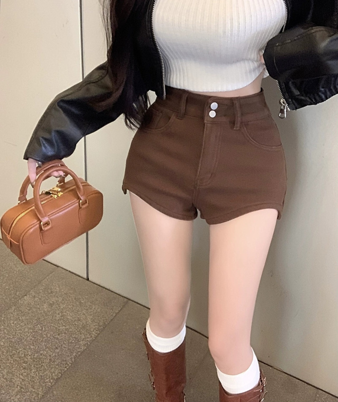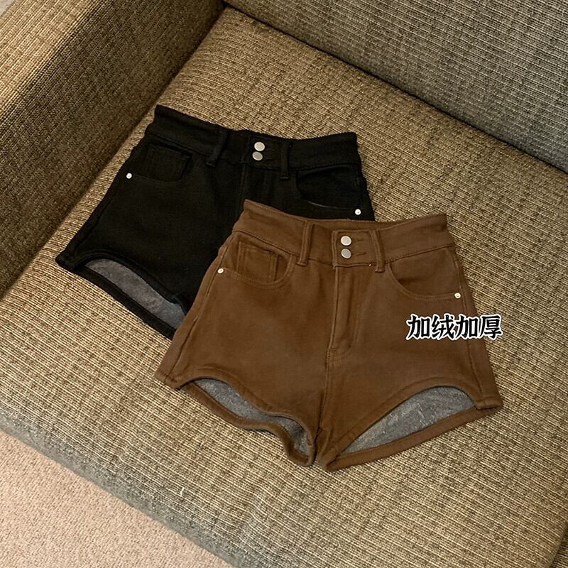 不規則なブラウンデニムショートパンツ女性春ベルベット肥厚パンツハイウエストスリムフィット弾性ヒップカバーパンツ ハイウェスト エラスティック 伸縮 スプリング 春物 ショーツ ブルマー bstraw61078826591 | beaute25