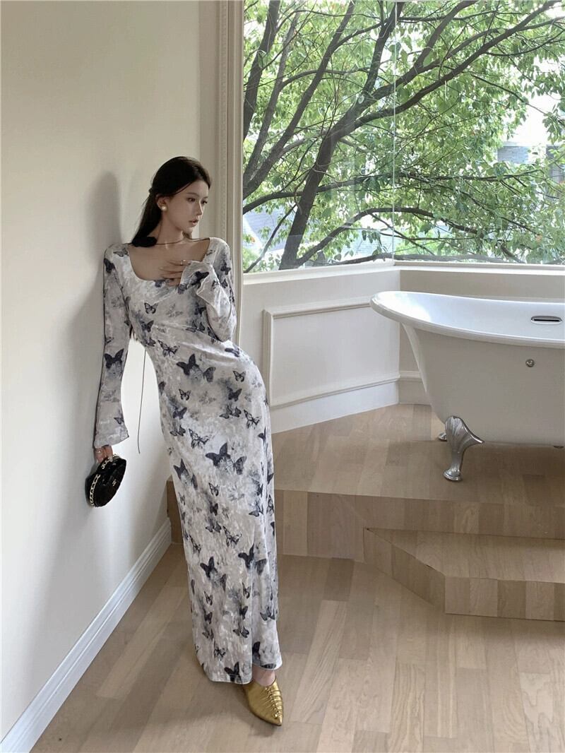 ゴールドベルベット蝶プリント長袖スクエアネックドレスレディース春フレンチスタイル女性ウエスト A ラインスカート ロング スプリング 春物 Aライン スクウェア bstraw41758373081 | beaute25