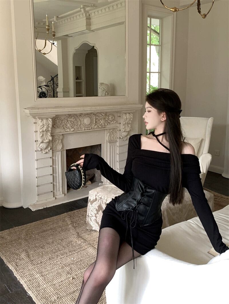 春の黒の斜めショルダー ニット ドレスの女性、ウエストバンド、ボトムとインナー スカート、セクシーなタイトなヒップ抱きショート スカート ブラック スプリング 春物 bstraw38822738716 | beaute25