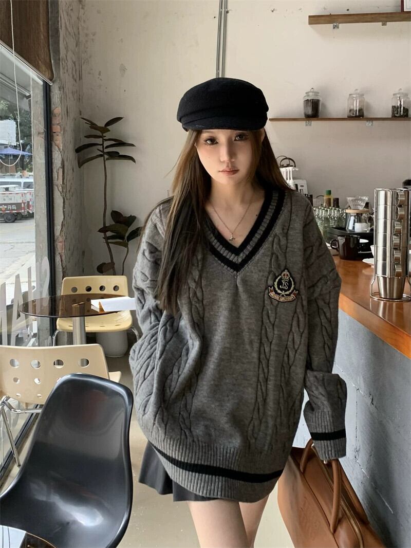 バッジパッチグレー V ネック長袖ツイストセーターレディース春プレッピープルオーバールーズニットセータートップ ロング スプリング 春物 Vネック bstraw50213013066 | beaute25