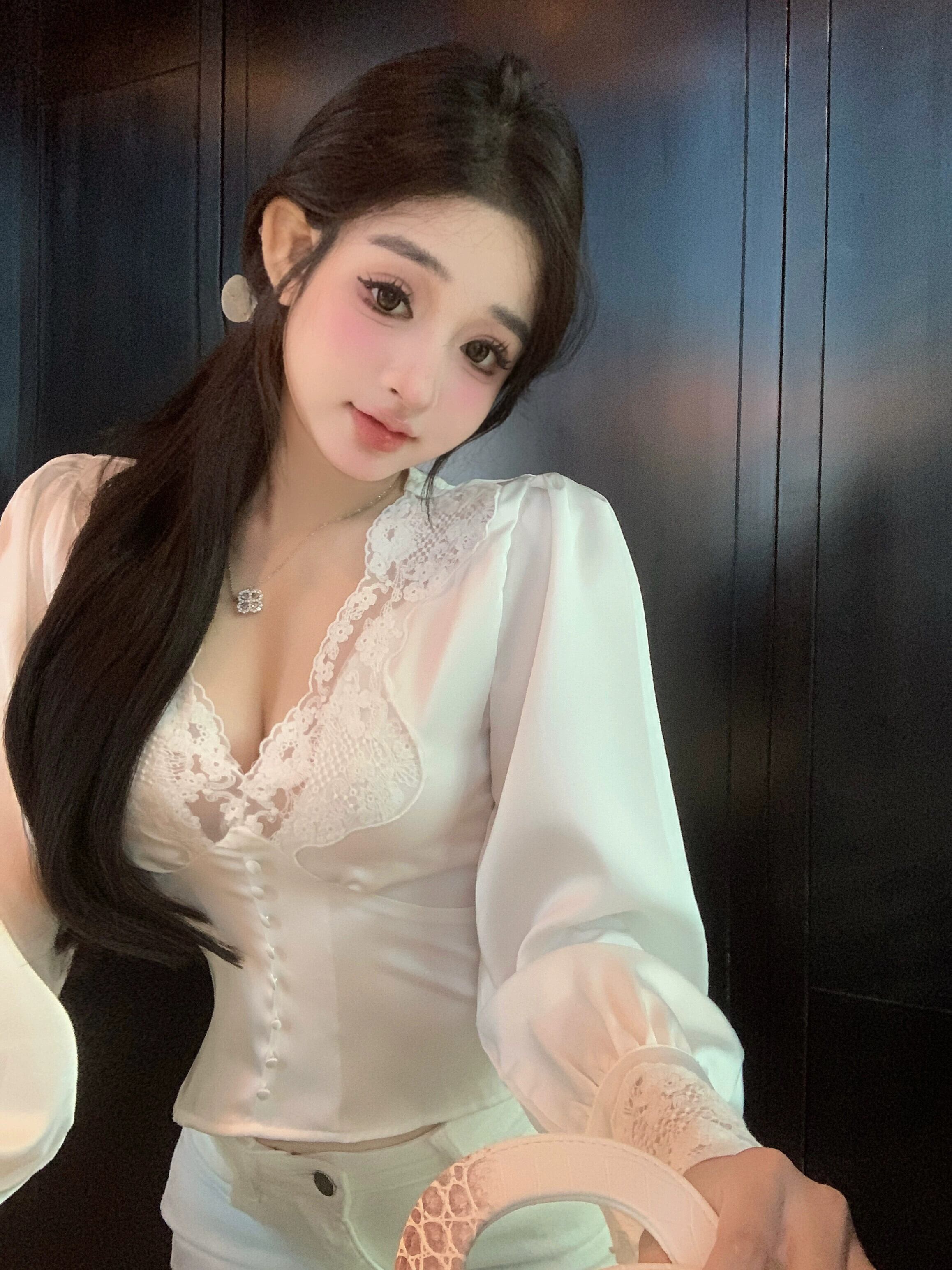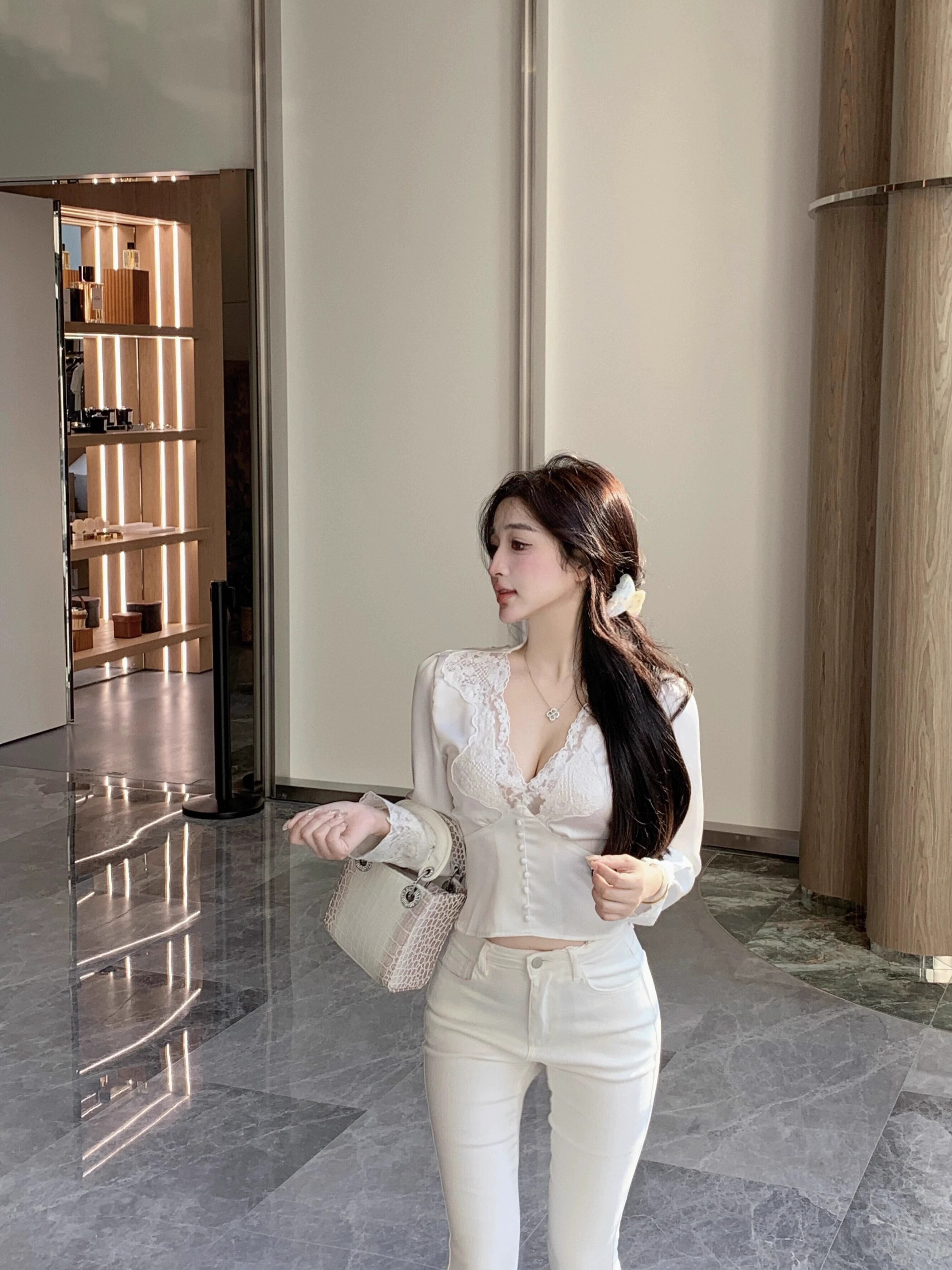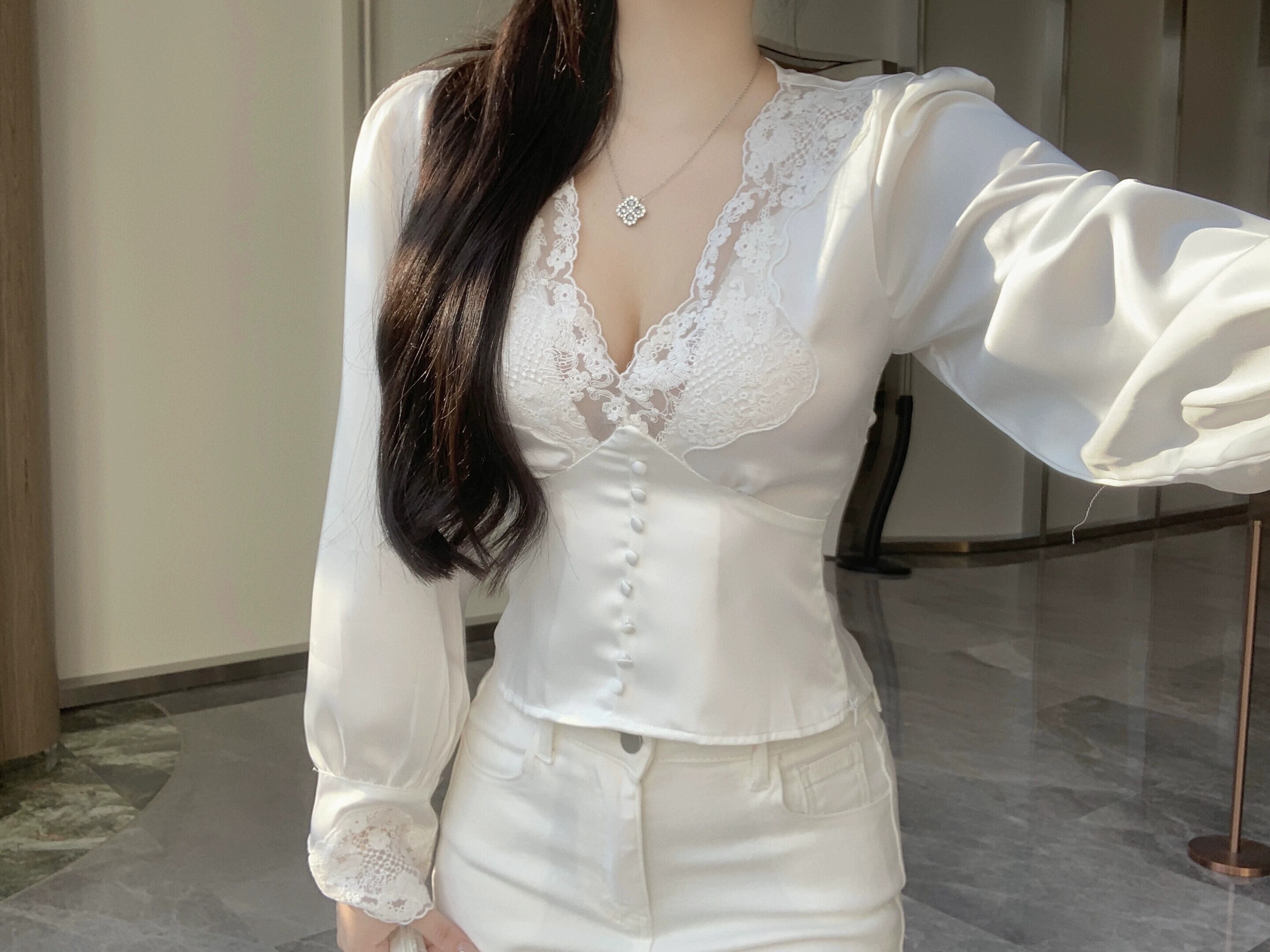 レーススプライシングシャツ女性の春 V ネック長袖シャツフレンチホワイトアセテートサテンハイエンドウエストトップ ロング スプリング 春物 Vネック bstraw43922891228 | beaute25